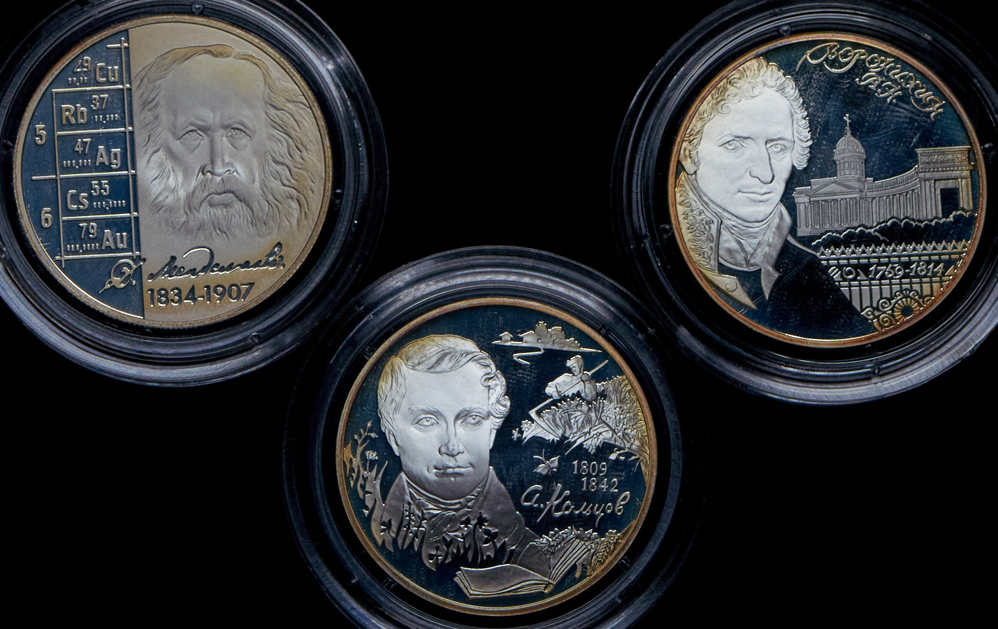 Серебро 925 пробы. 2 рубля 2009 года "Менделеев Д.И., 175 лет со дня рождения" 2 рубля 2009 года "Воронихин А.Н., 250 лет со дня рождения" 2 рубля 2009 года "Кольцов А.В., 200 лет со дня рождения"