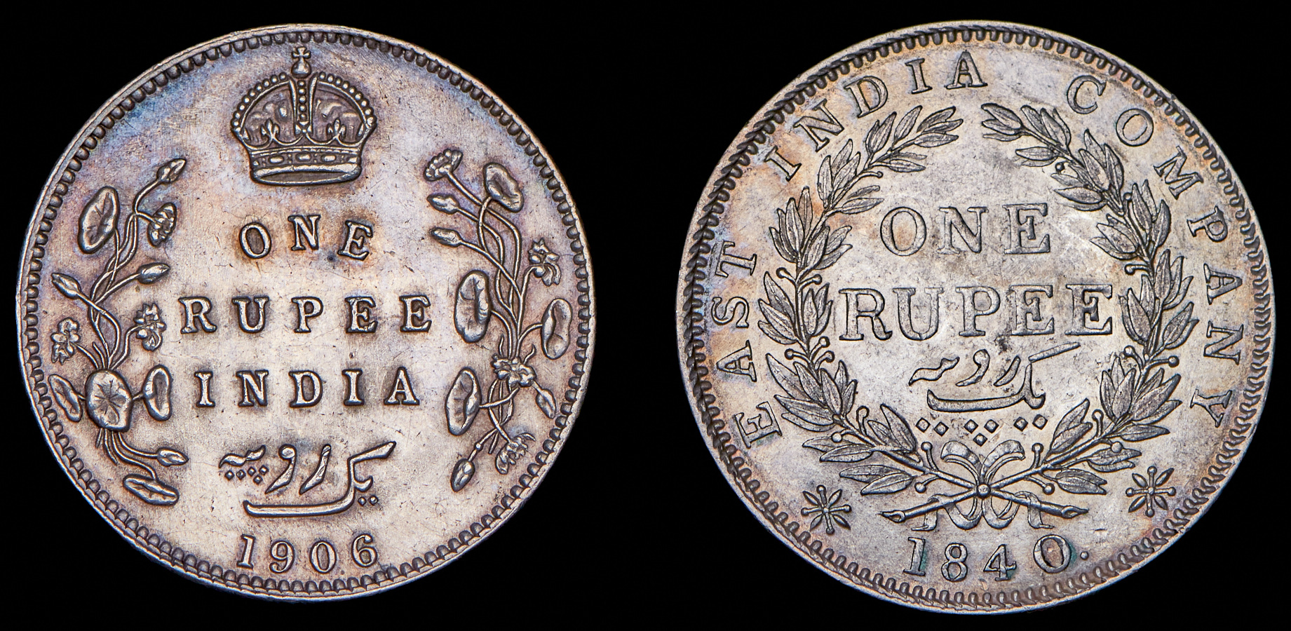 1 рупия 1906 (Индия), 1 рупия 1840 (Британская Ост-Индская Компания).AU.