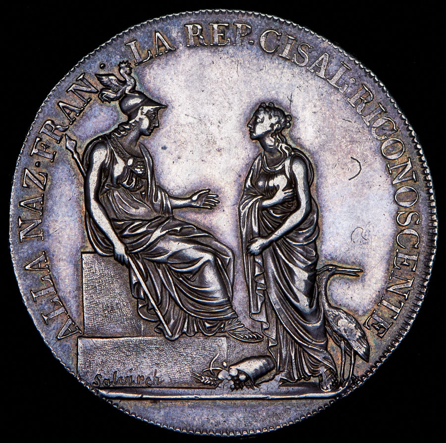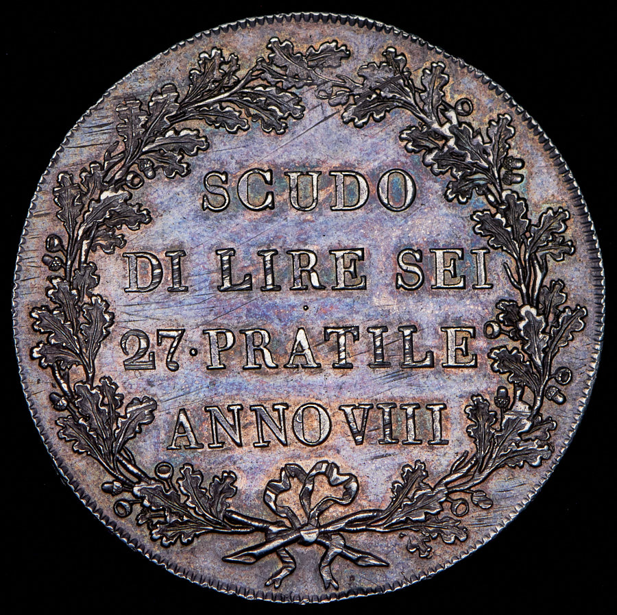 Отчеканена в честь Алессандрийской конвенции (15 июня 1800 года = 27 года претиля VIII) после победы французской армии в битве при Маренго.