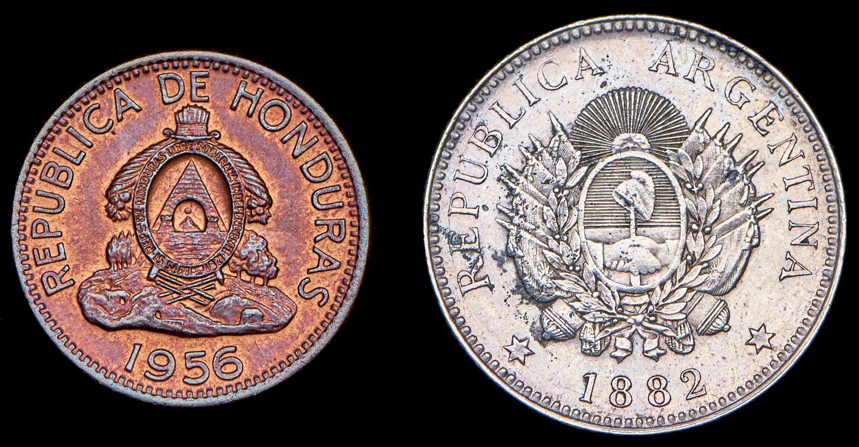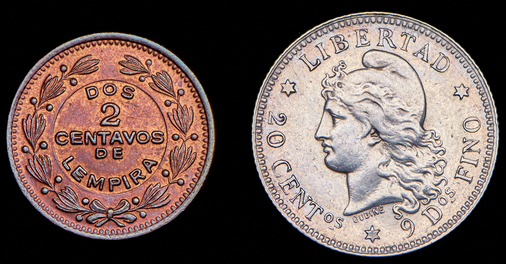 2 сентаво 1956 (Гондурас), 20 сентаво 1882 (Аргентина). Различные металлы.XF-AU.