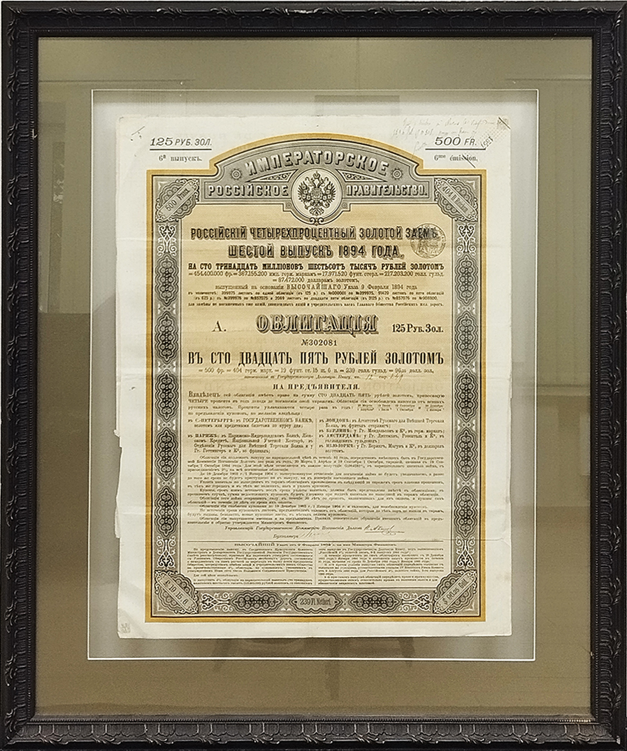 Облигация 125 рублей золотом "Российский 4% золотой заем, 6 выпуск, 1894 г."
