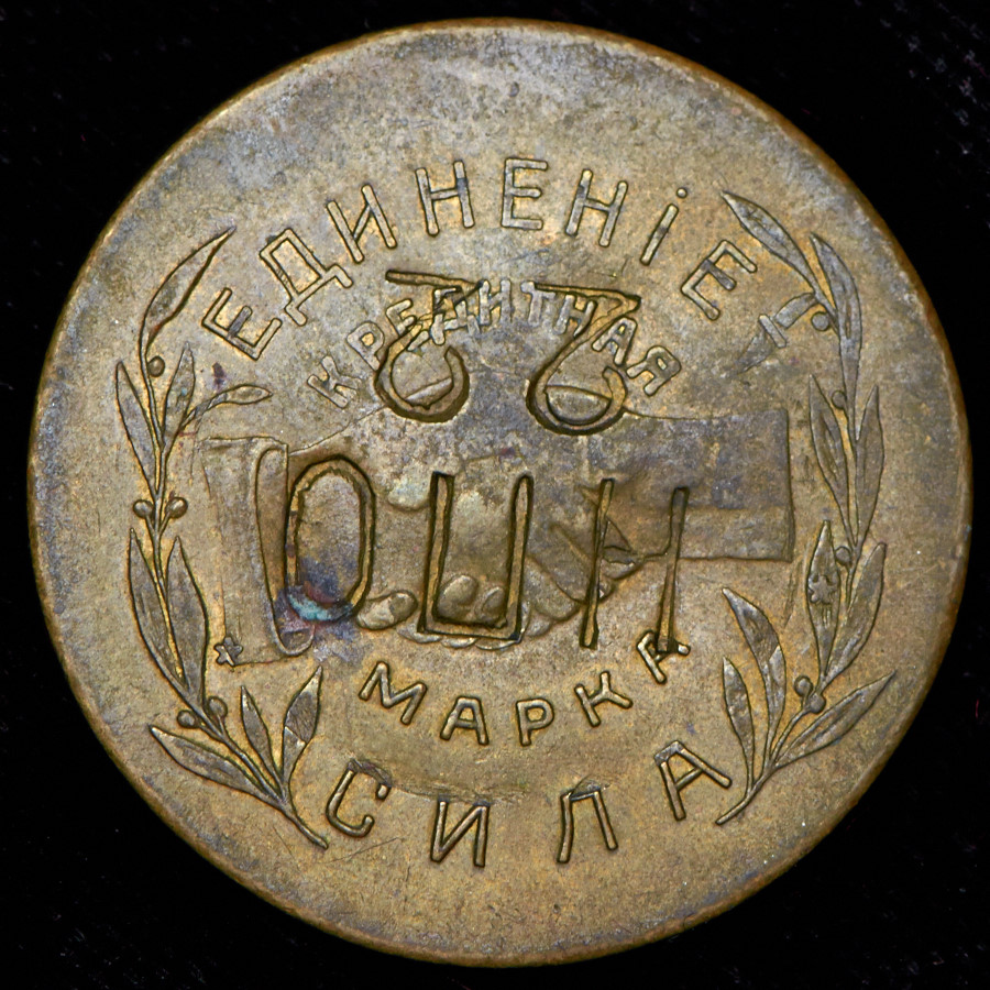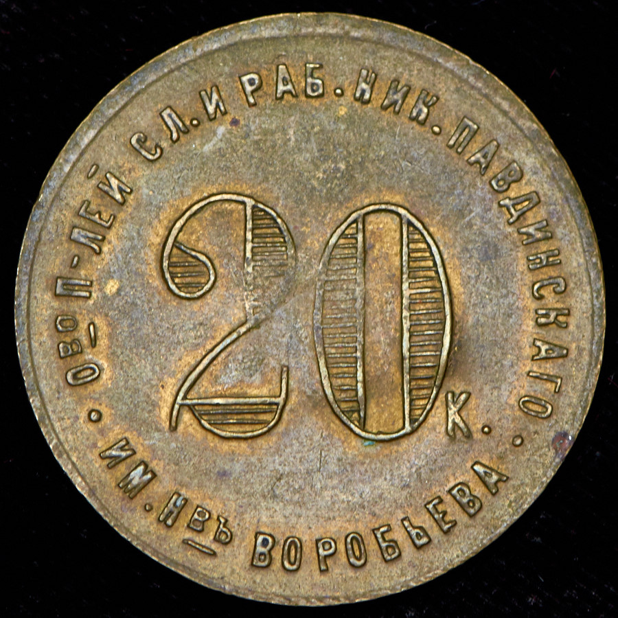 Общество потребителей служащих и рабочих Николо-Павдинского имения наследников Воробьева. Кредитная марка-жетон 20 копеек, с надчеканом "НПО 22" - рабочий кооператив 1922 года.