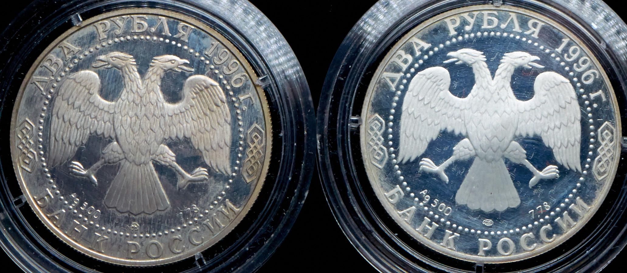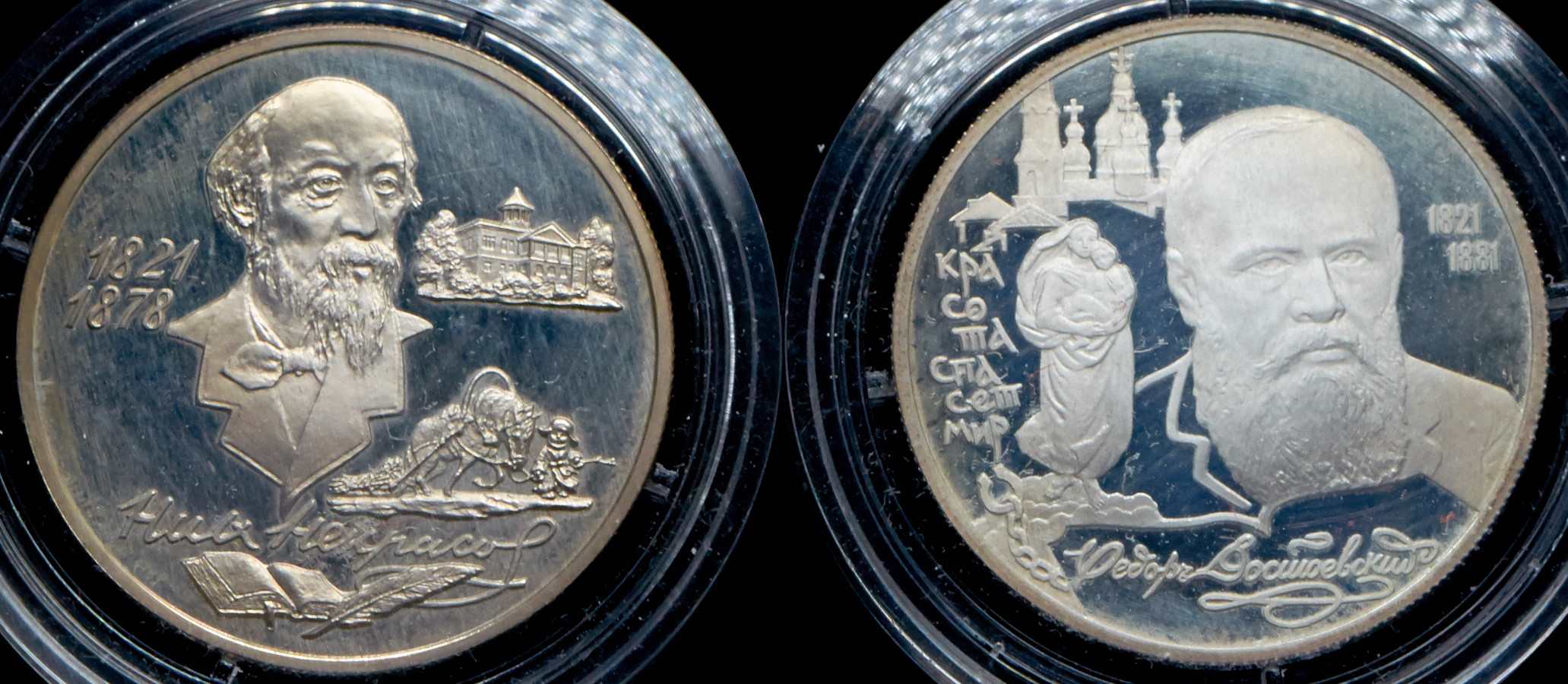 Серебро 500 пробы. 2 рубля 1996 "Некрасов Н.А., 175 лет со дня рождения" 2 рубля 1996 "Достоевский Ф.М., 175 лет со дня рождения".