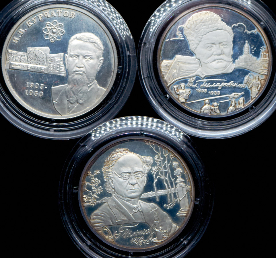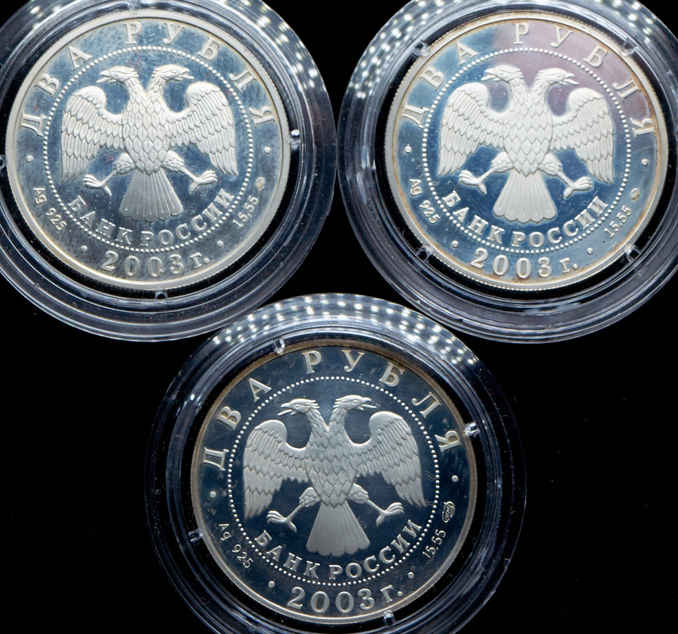 Серебро 925 пробы. 2 рубля 2003 "Курчатов И.В., 100 лет со дня рождения" 2 рубля 2003 "Тютчев Ф.И., 200 лет со дня рождения" 2 рубля 2003 "Гиляровский В.А., 150 лет со дня рождения"
