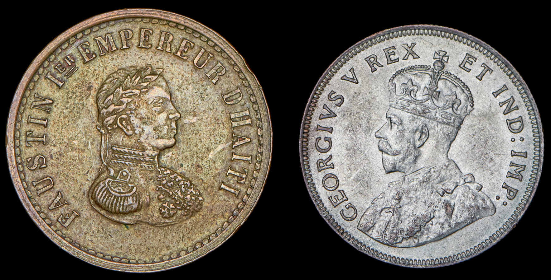 1 шиллинг 1924 (Восточная Африка), 10 сантимов 1855 Пробная (Гаити). Различные металлы.