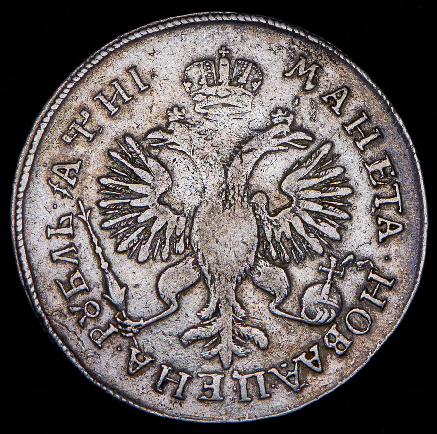 Кадашевский монетный двор. Инициалы медальера "ОК", без арабесок на груди, в круговой надписи "РОСNI" вместо "РОСИI". "L" на лапе орла, "МАНЕТА".