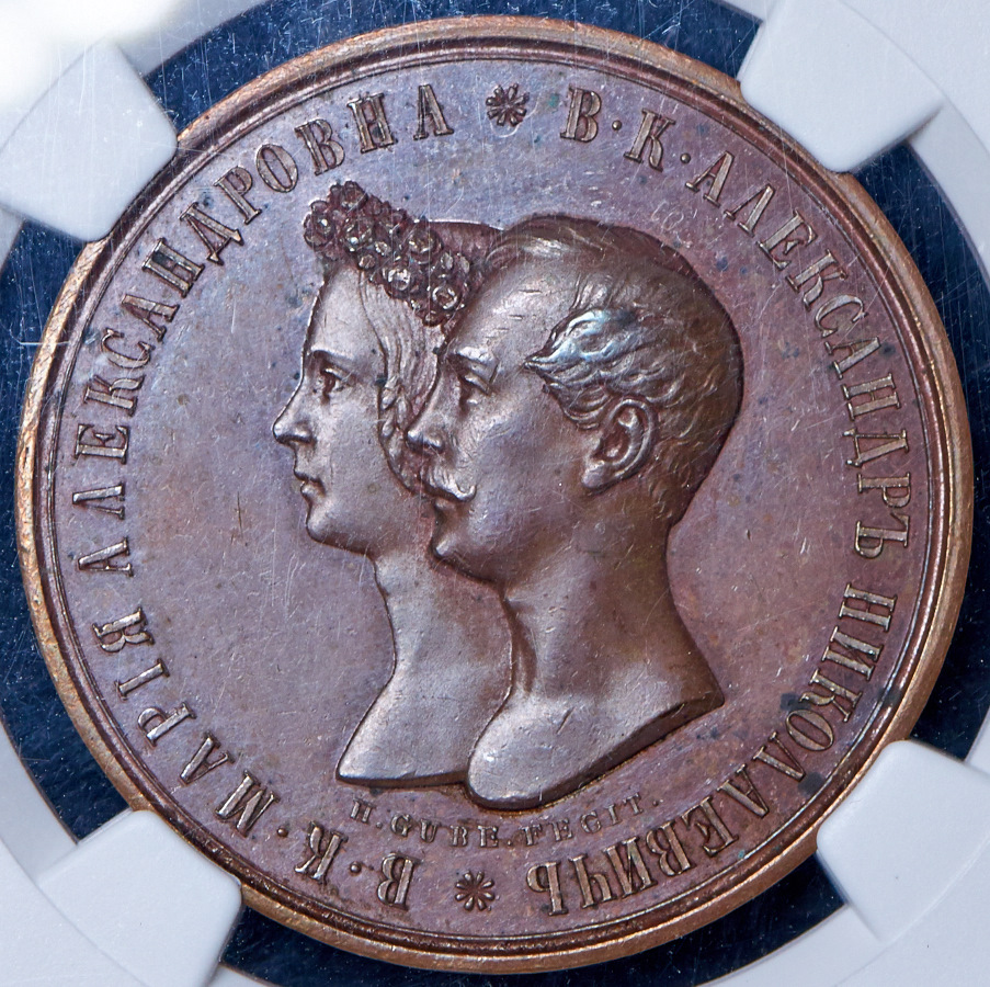 Чеканена по случаю бракосочетания Великого Князя Александра Николаевича, будущего императора Александра II, и Марии Александровны.