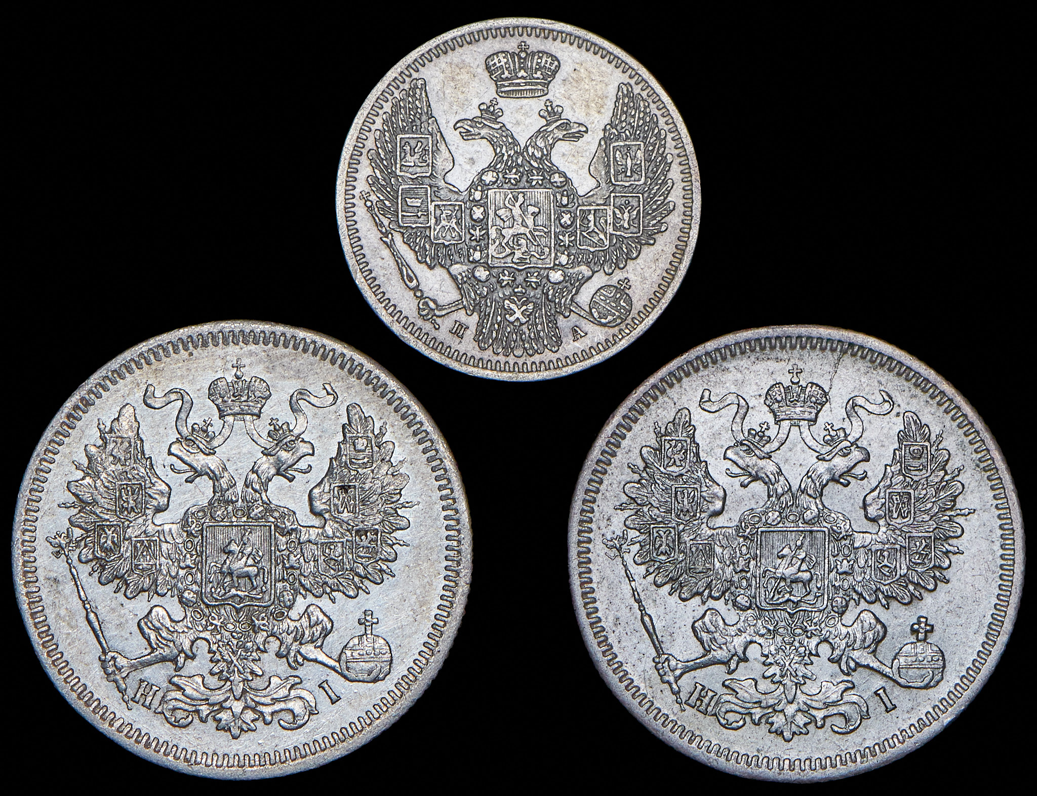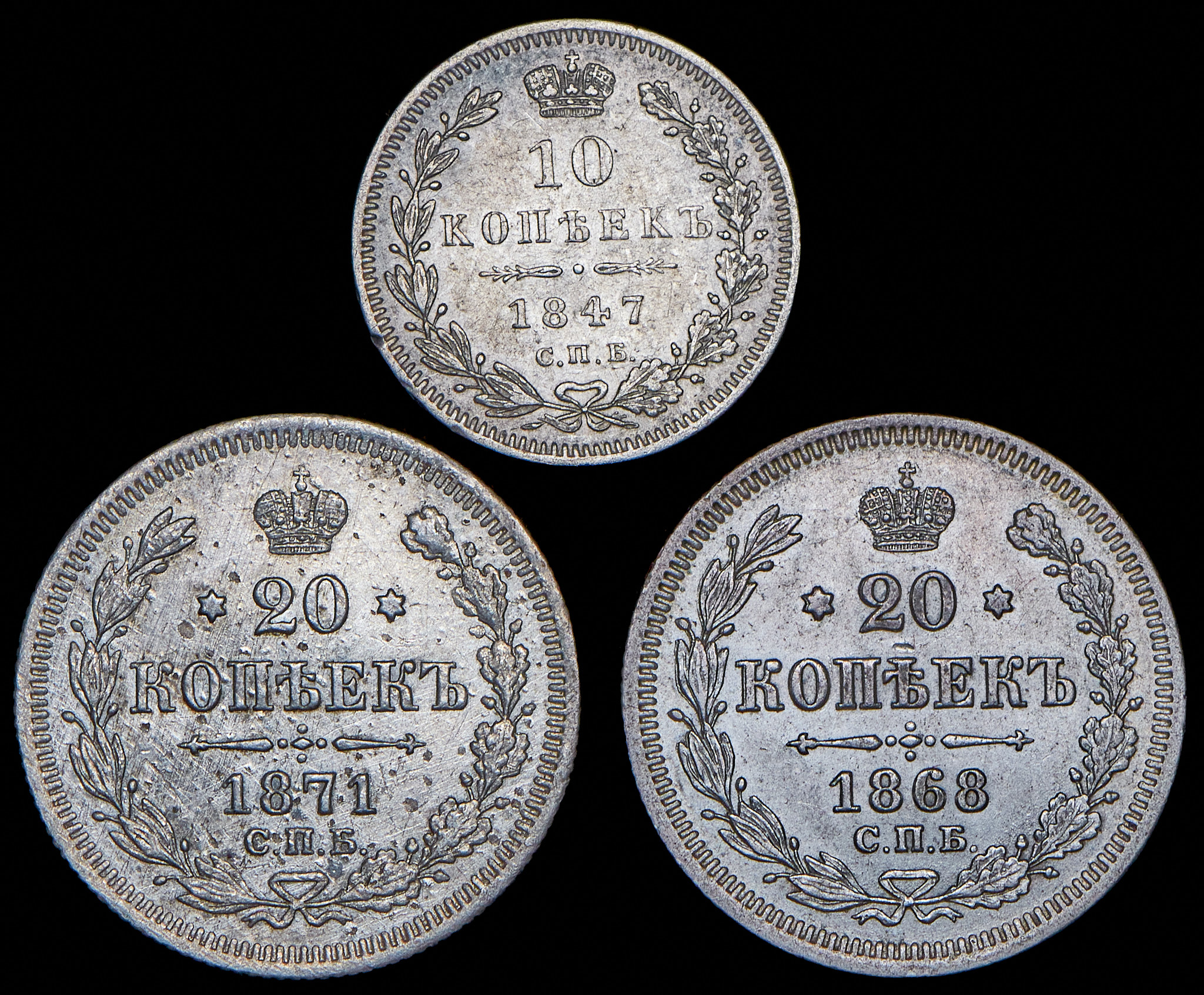 XF-AU.10 копеек 1847 СПБ-ПА, 20 копеек 1868 СПБ-НI, 20 копеек 1871 СПБ-HI.