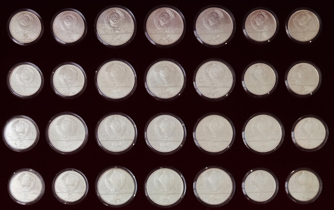 Полный комплект серебряных монет номиналом 10 и 5 рублей, выпущенных к XXII Олимпийским играм 1980 года в Москве. В подарочных коробках. Каждого номинала по 14 шт.