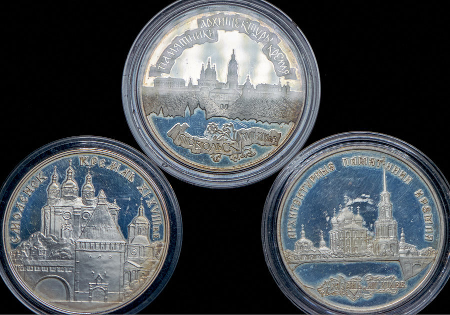 3 рубля 1994 "Рязань". 3 рубля 1995 "Смоленск". 3 рубля 1996 "Рязань". 3 рубля 1996 "Тобольск" 3 рубля 2009 "Тульский кремль"