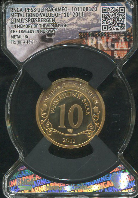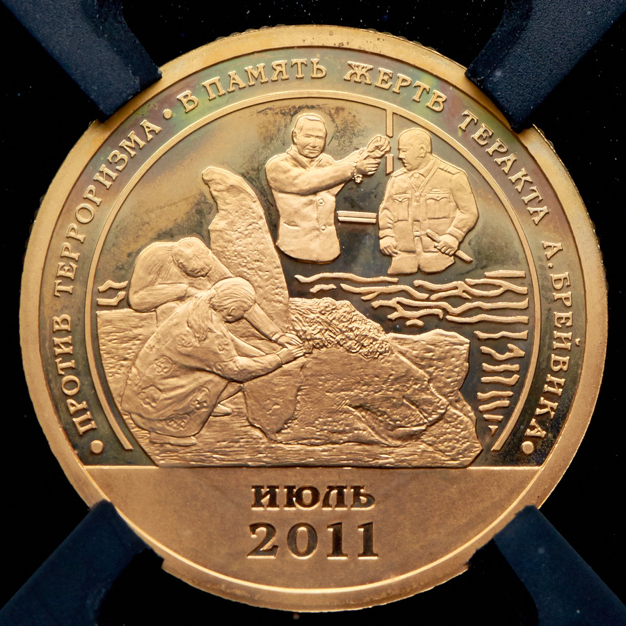 Разменный знак 10 единиц 2010 г. “Против терроризма. В память о жертвах теракта А. Брейвика, июль 2011 г.”