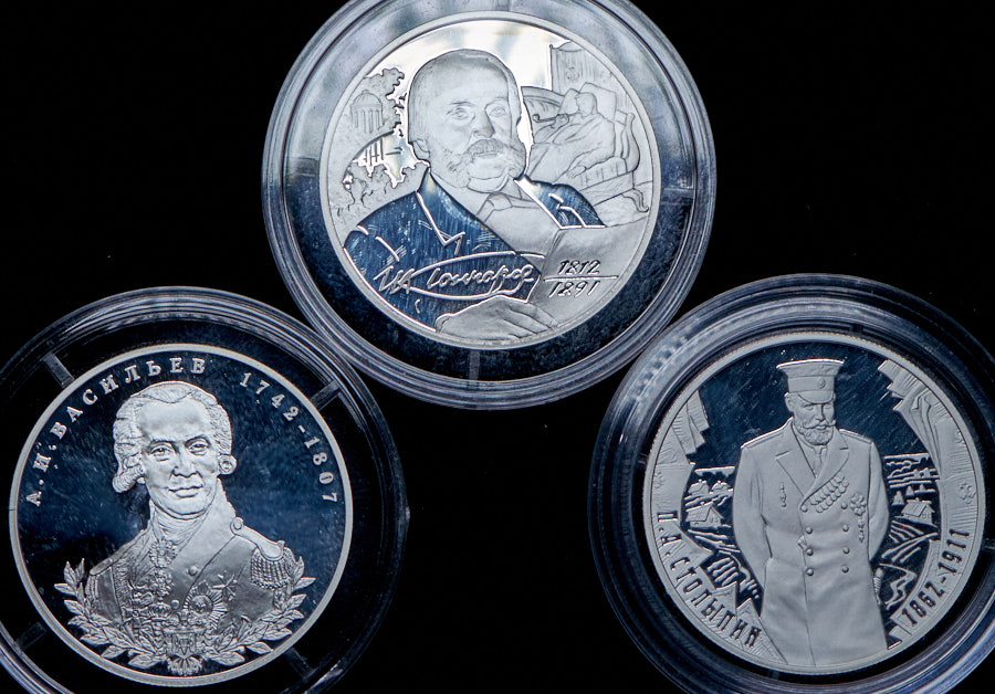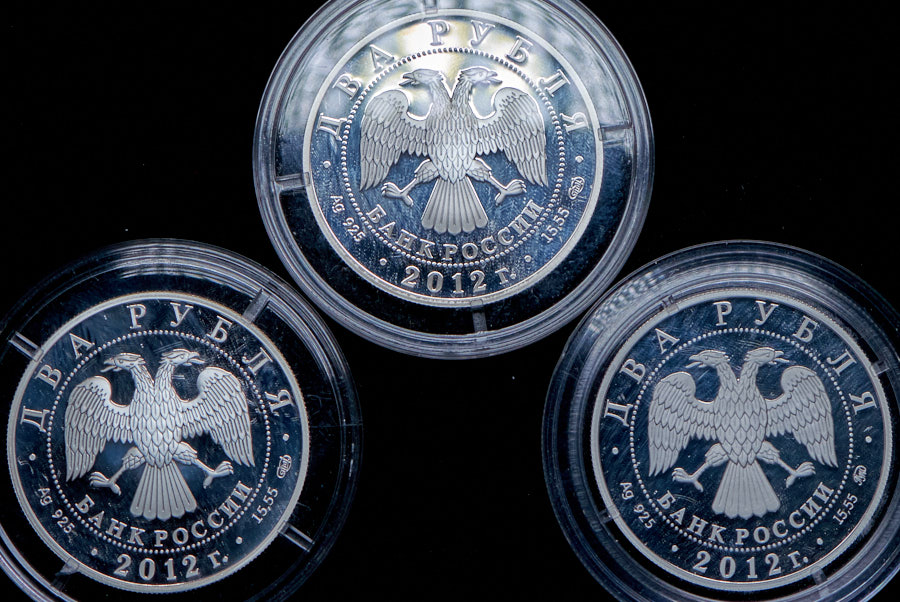Серебро 925 пробы. 2 рубля 2012 года "Столыпин П.А., 150 лет со дня рождения" 2 рубля 2012 года "Гончаров И.А., 200 лет со дня рождения" 2 рубля 2012 года "Васильев А.И., 270 лет со дня рождения"