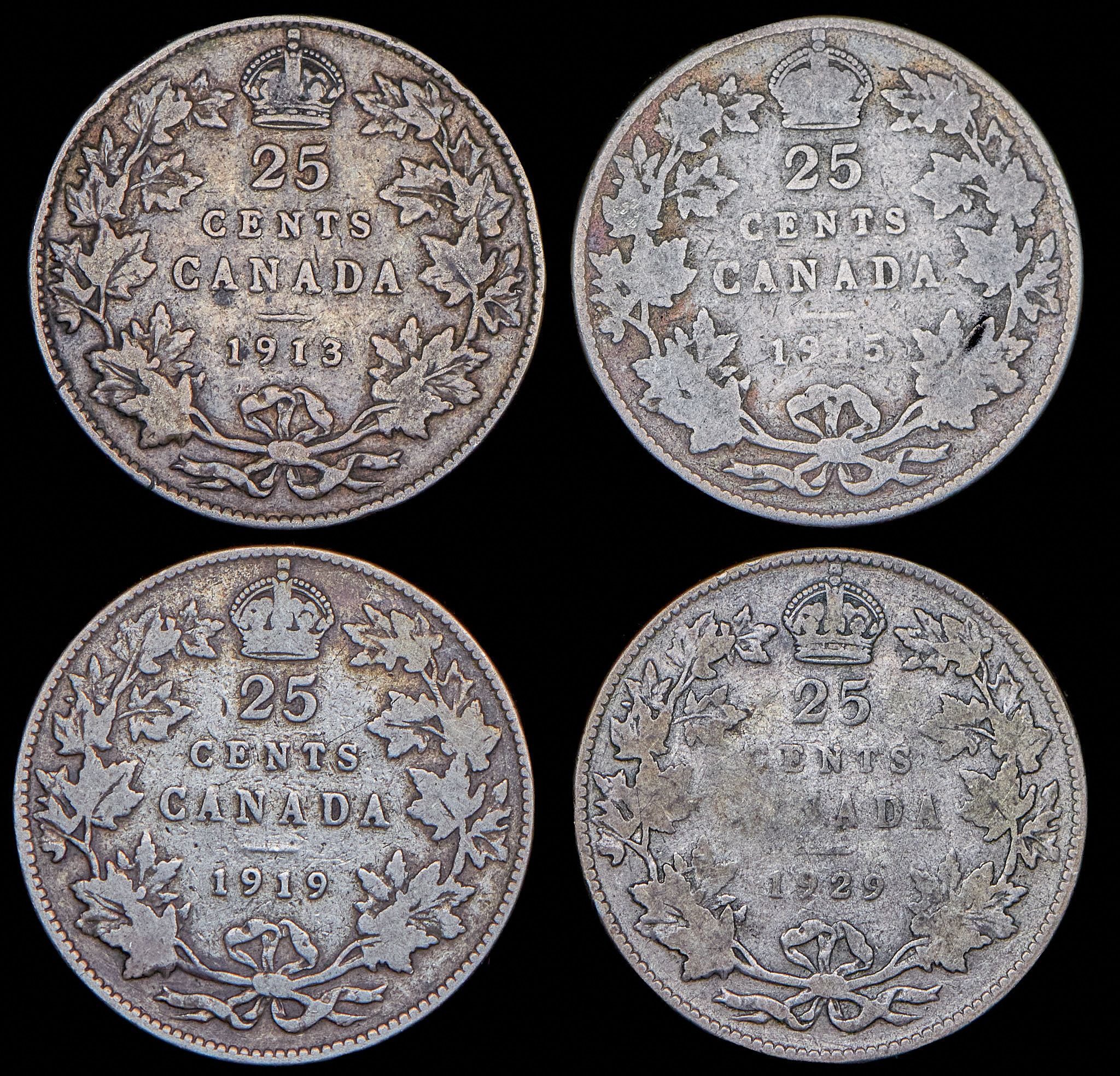 Набор из 4 сер. монет 25 центов 1913-1925 (Канада)
