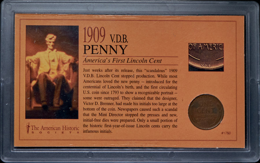 Всего через несколько недель после выпуска этот «скандальный» цент Линкольна V.D.B. 1909 года был снят с производства. Хотя большинство американцев были в восторге от нового пенни, выпущенного к столетию со дня рождения Линкольна и ставшего первой монетой США с 1793 года с узнаваемым портретом, некоторые были возмущены. Они утверждали, что дизайнер, Виктор Д. Бреннер, сделал свои инициалы в нижней части монеты слишком большими. Газеты устроили такой скандал, что директор Монетного двора остановил печатные станки и изготовил новые штампы без инициалов. Лишь небольшая часть исторических центов Линкольна первого года выпуска носит эти печально известные инициалы.