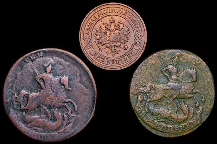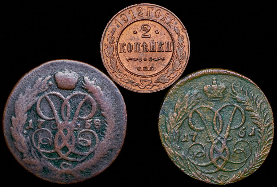 VG-F. В набор вошли:- 2 копейки 1758 (ММД)- 2 копейки 1761 - 2 копейки 1912 (СПБ)