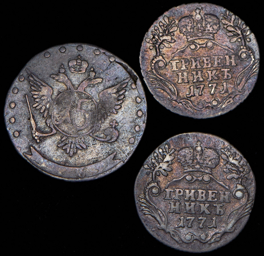 VG-F. Гривенник 1771 СПБ (2 шт.), 15 копеек 1769 ММД.