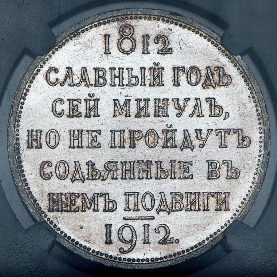 Чеканена в честь 100-летия победы в Отечественной войне 1812 года.