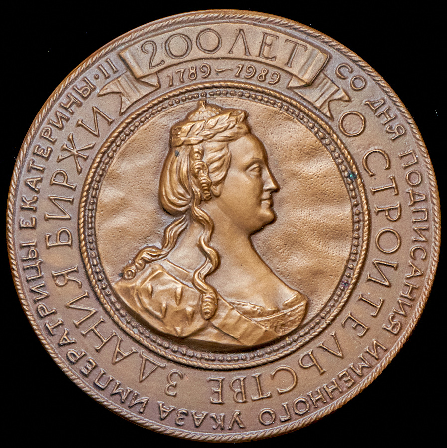 Медаль в память 200-летия со дня подписания именного указа императрицы Екатерины II о строительстве в Москве здания биржи и 150-летия со дня открытия Московской товарной биржи и организации Биржевого комитета. ЛМД, 1992 год. Томпак. Диаметр 70 мм. Салыков-1992# 16.