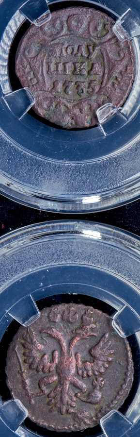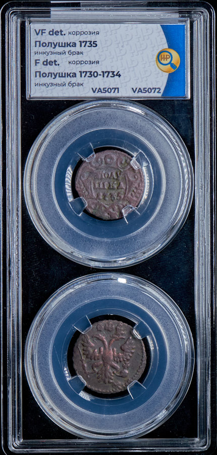 2) Полушка 1730-1734 гг. Инкузный брак. F det, коррозия.