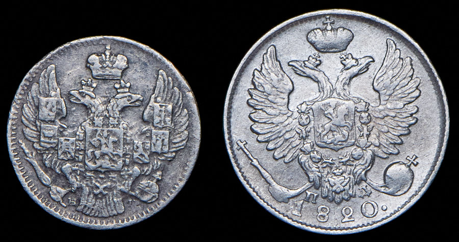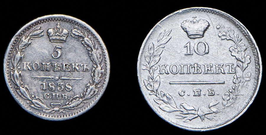 10 копеек 1820 СПБ-ПД, 5 копеек 1838 СПБ-НI.