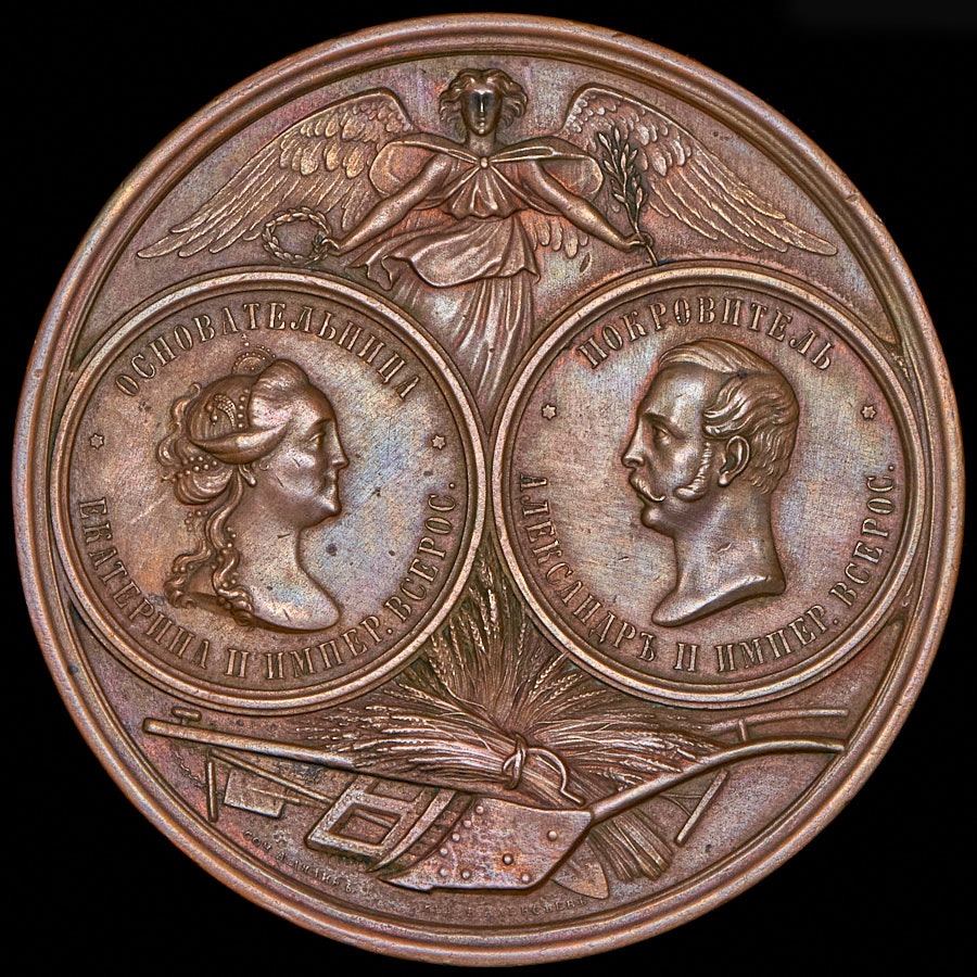 Описание аверса: В центре, обрамленные круговыми надписями, обращенные друг к другу два бюста Екатерины II и Александра II, сверху крылатый ангел, с венком в правой руке и оливковой ветвью в левой, под бюстами орудия земледелия и снопы пшеницы, внизу подписи СОЧ . А . ЛЯЛИНЪ РѢЗ . В . АЛЕКСѢЕВЪ (Сочинил А . Лялин. Резал В. Алексеев)