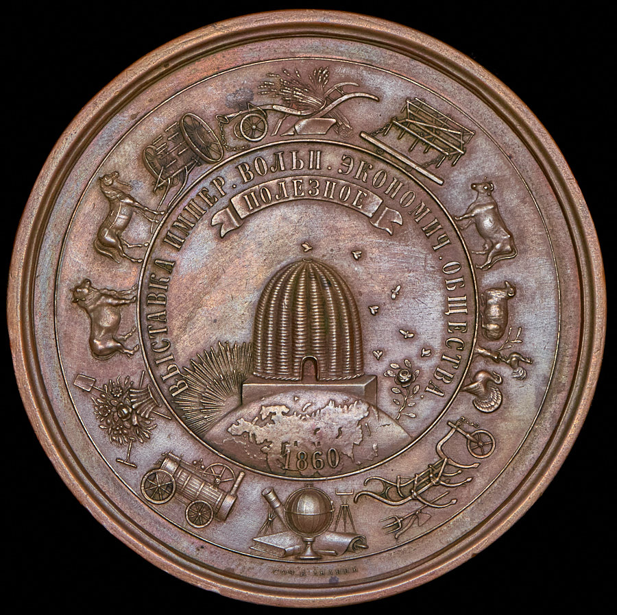 Описание реверса: В центральном медальоне на модели земного шара с картой России и датой 1860 - улей, справа от него вьющиеся вокруг цветка пчелы, слева восходящее солнце, по окружности изображения домашних животных, сельскохозяйственных орудий, вазы с цветами и глобуса. Внизу подпись СОЧ . А . ЛЯЛИНЪ (Сочинил А. Лялин)