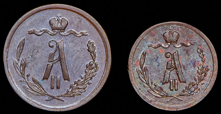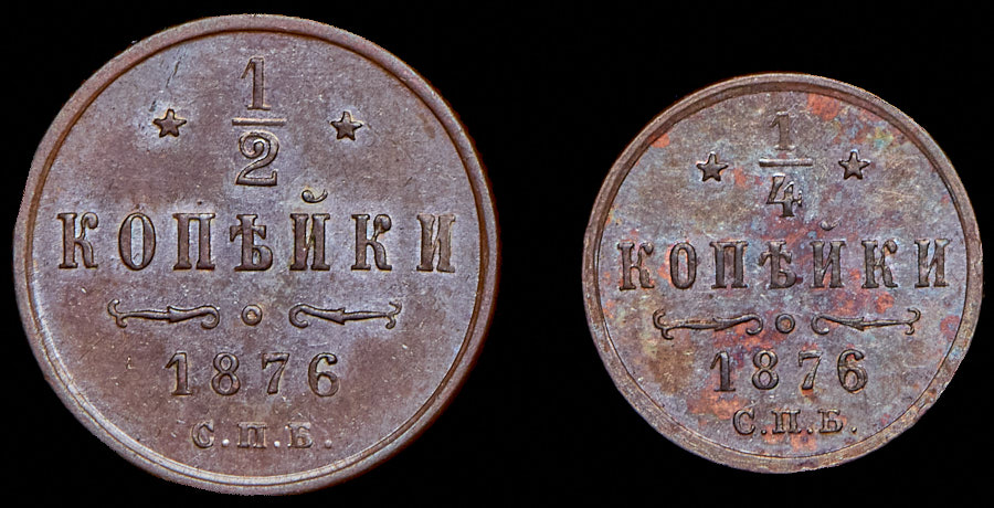 Набор из 2 медных монет 1/2 и 1/4 копейки 1876 СПБ