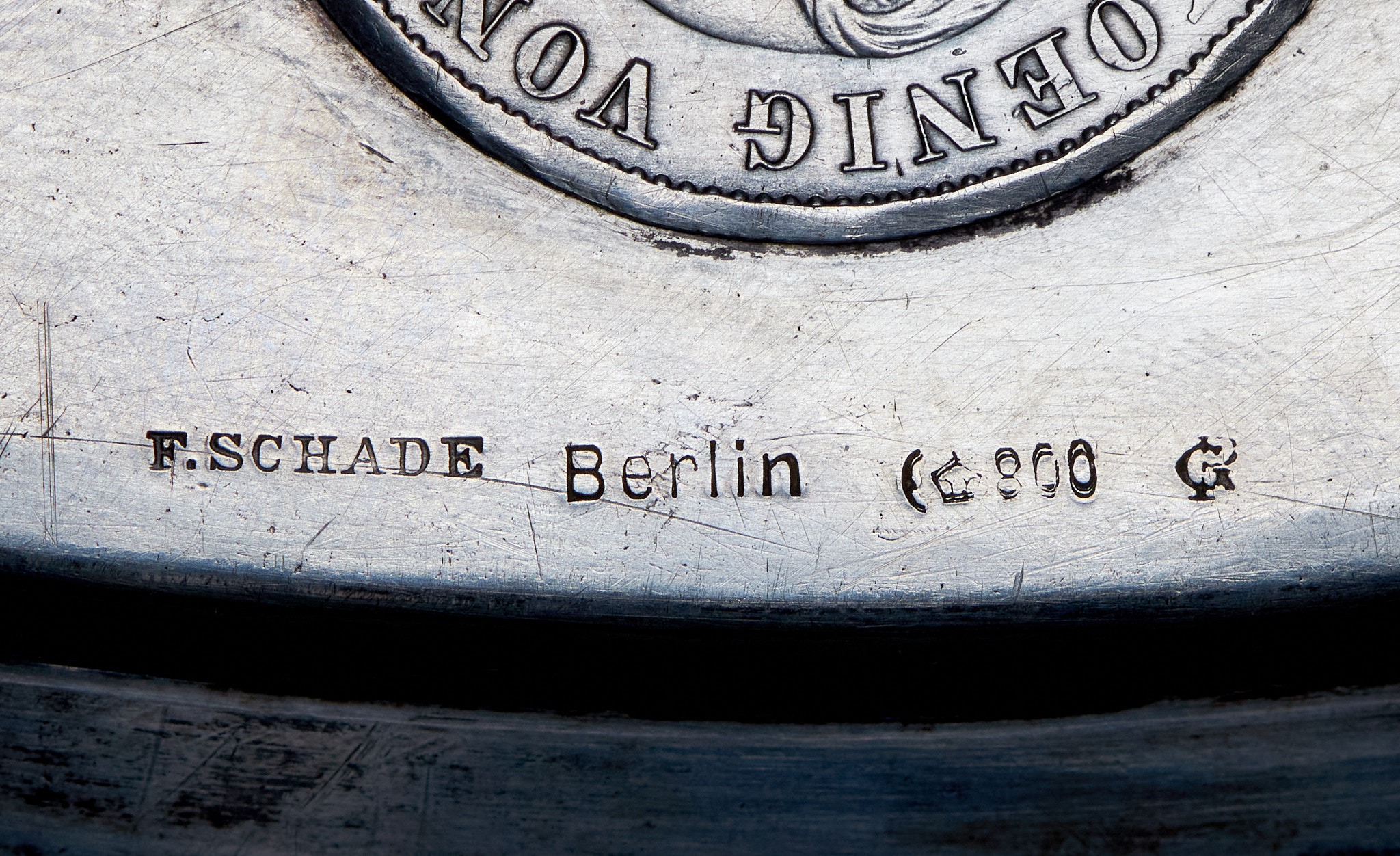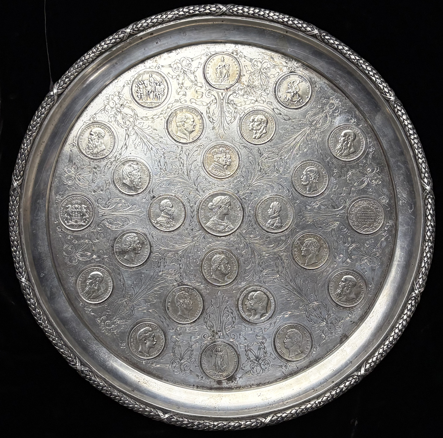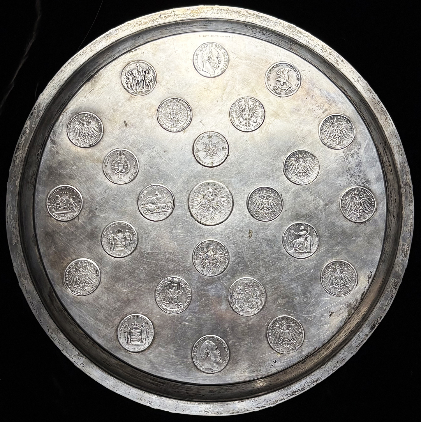 Поднос из серебра 800 пробы. Вмонтировано 25 монет.Диаметр 38 см.