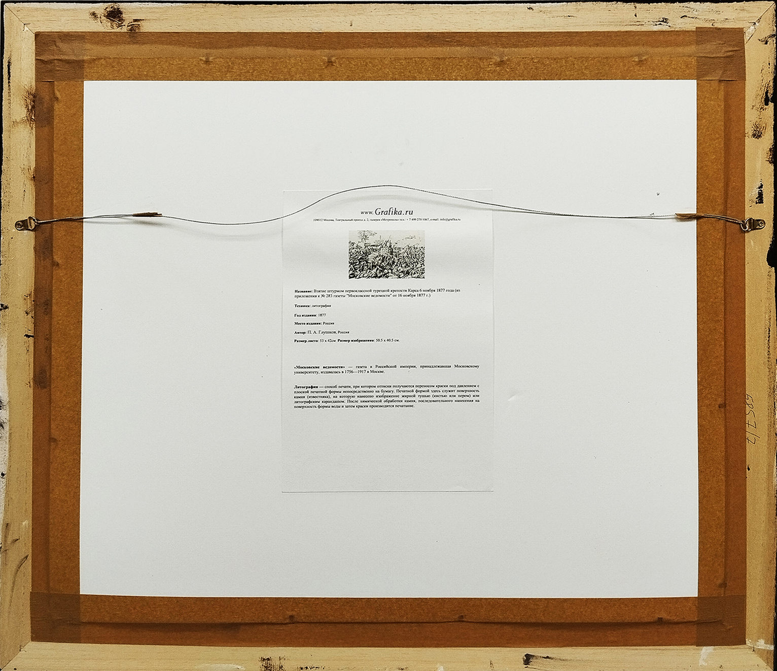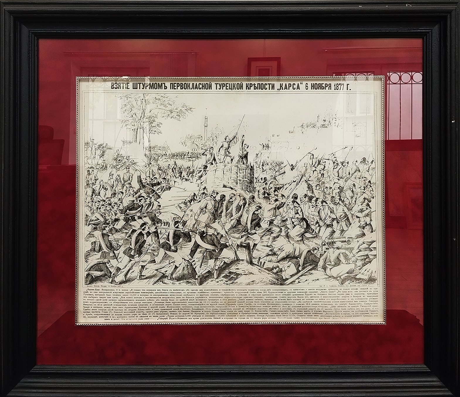 Литография (копия): "Взятие штурмом первоклассной турецкой крепости Карса 6 ноября 1877 года" (из приложения к №283 газеты "Московские ведомости" от 16 ноября 1877 г). Автор: П. А. Глушков. В раме с паспарту.