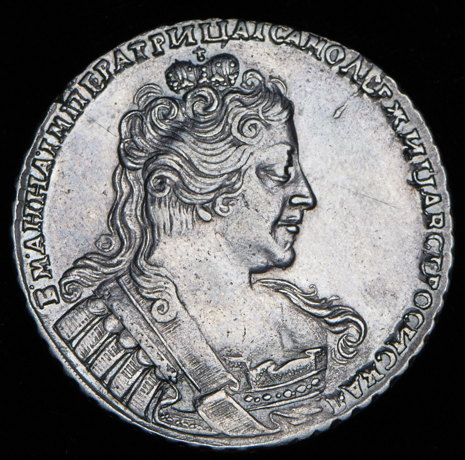 Кадашевский монетный двор. Особый портрет. Без броши на груди. На реверсе дата перегравирована из 1733. Корона закрытая, три звена цепи между шеями орла, головы орла с языками.