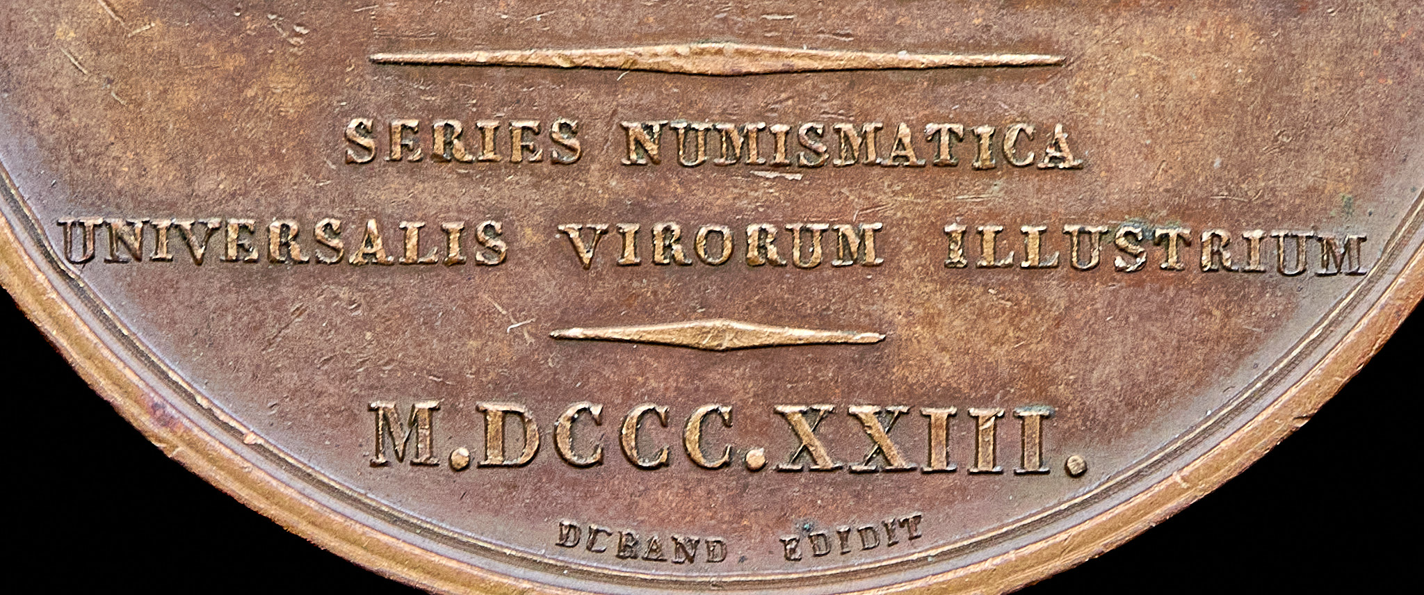 Медаль из французской серии XIX века, посвященной выдающимся личностям («Series Numismatica Universalis Virorum Illustrium"). Проект возглавил Пьер-Амеде Дюран (Pierre-Amédée Durand), который привлек известных европейских граверов для создания портретов ключевых фигур в искусстве, философии, науке, технике, религии и управлении.
