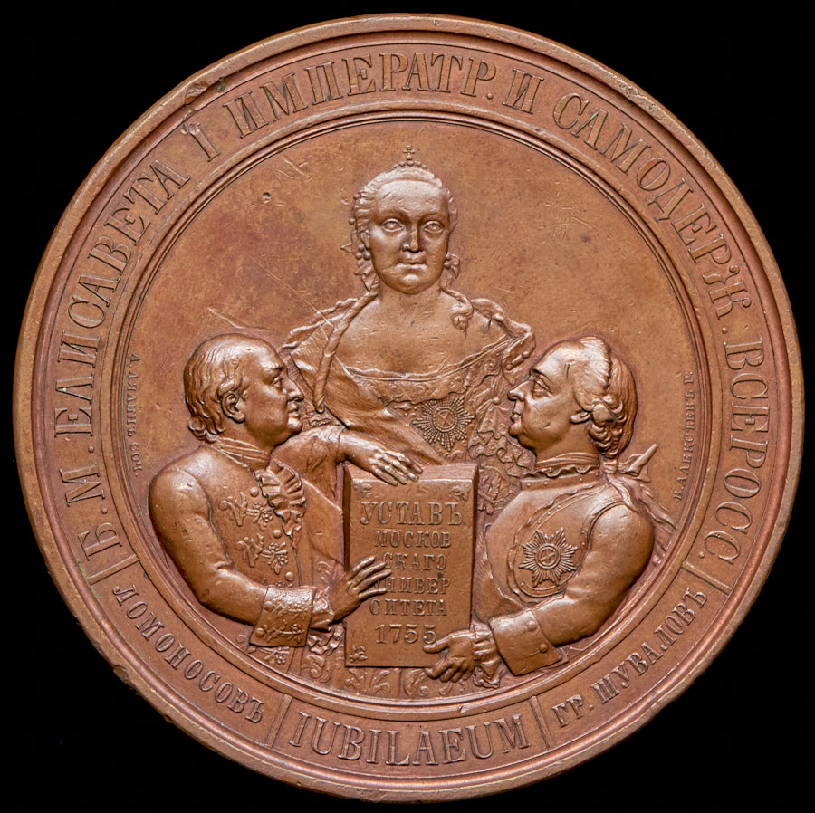В композиции аверса рядом с Императрицей Елизаветой Петровной стоит M.В. Ломоносов в академическом мундире и граф П.И. Шувалов в латах, со звездой ордена Андрея Первозванного и орденской лентой. Они преподносят Императрице Елизавете Петровне устав Московского Университета.