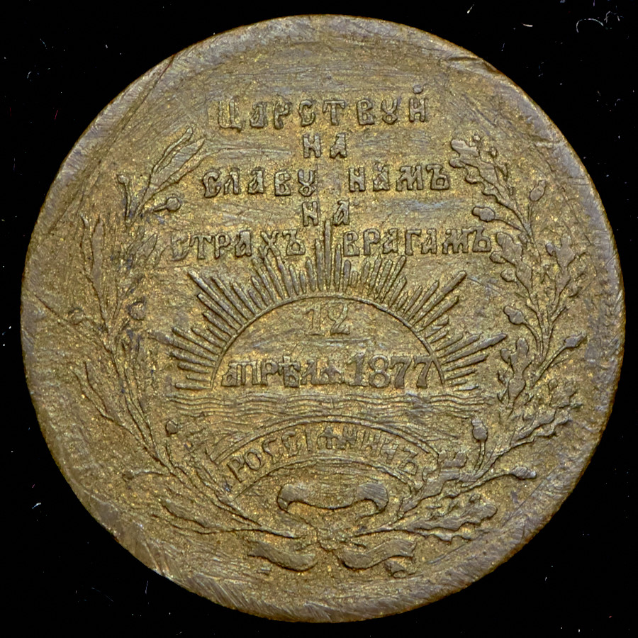 На оборотной "Царствуй на славу нам,на смерть врагам. 12 апреля 1877. Россиянин".