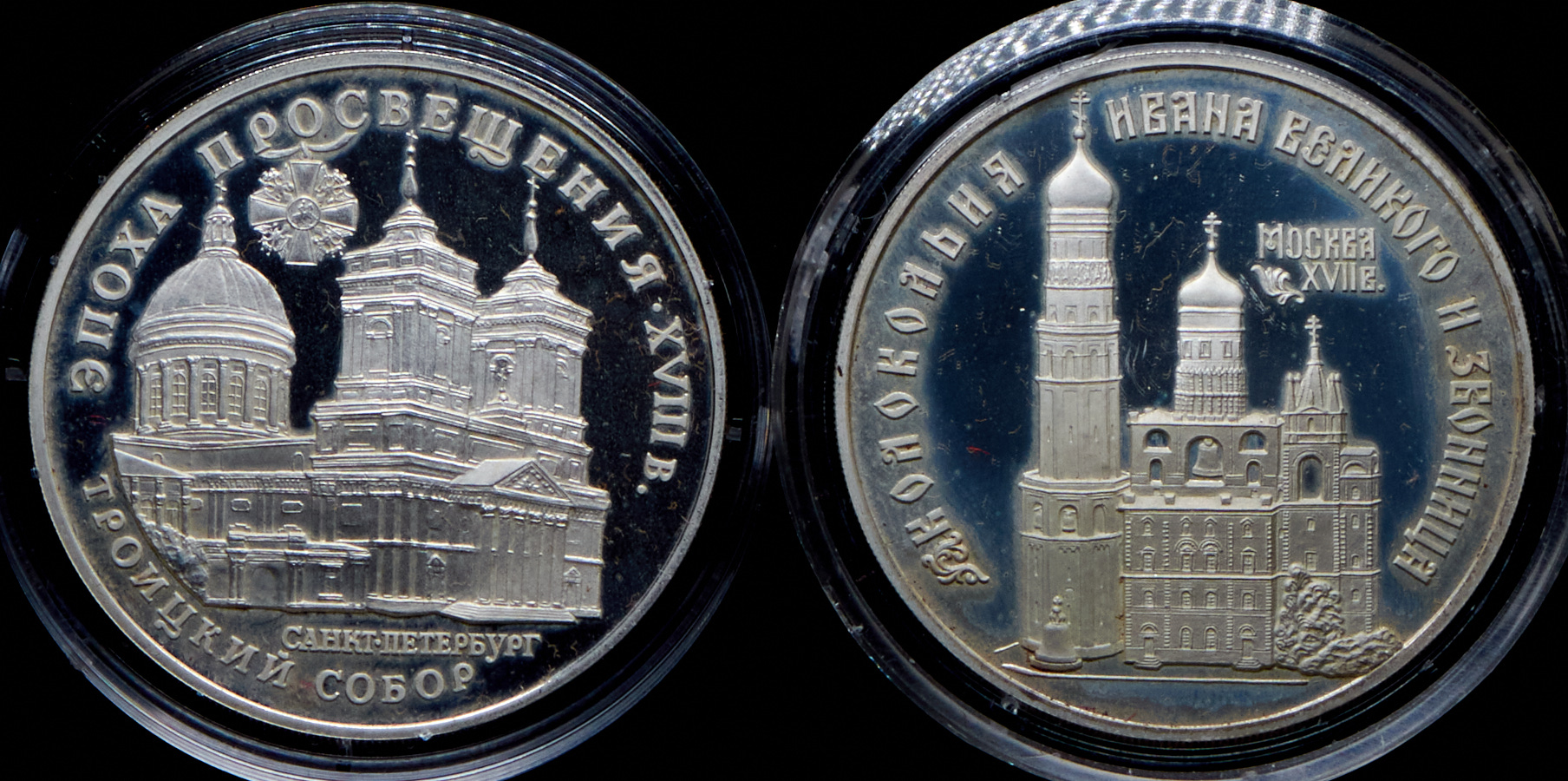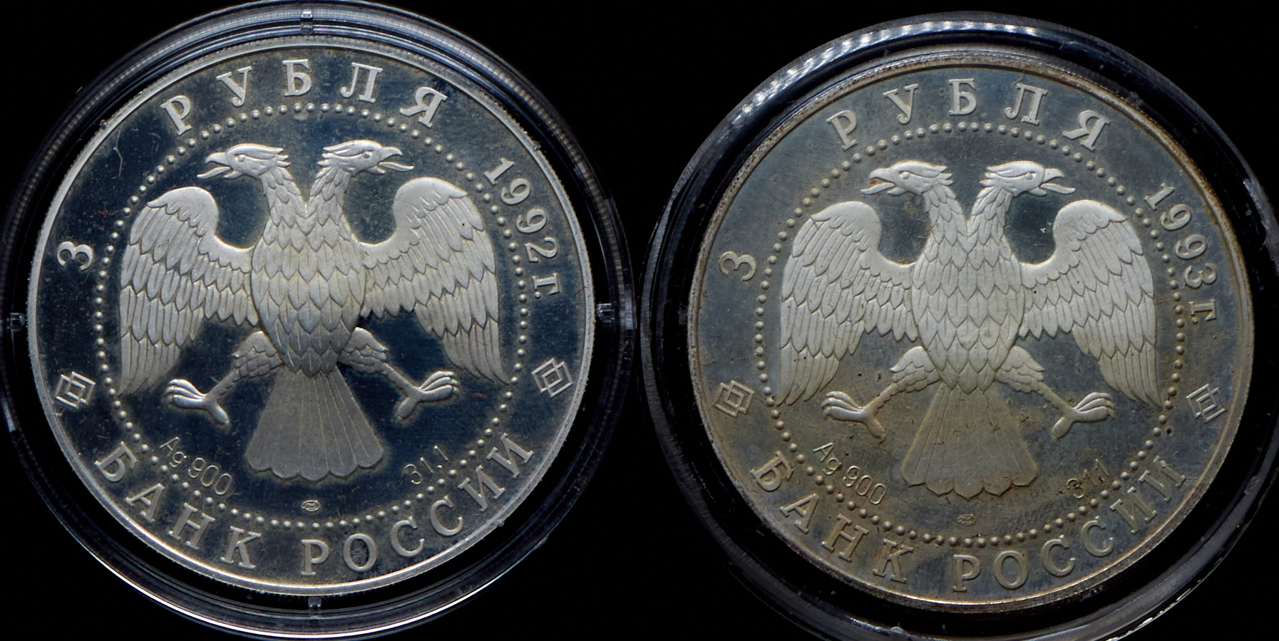 3 рубля 1992 "Троицкий собор" 3 рубля 1993 "Колокольня "Ивана Великого".