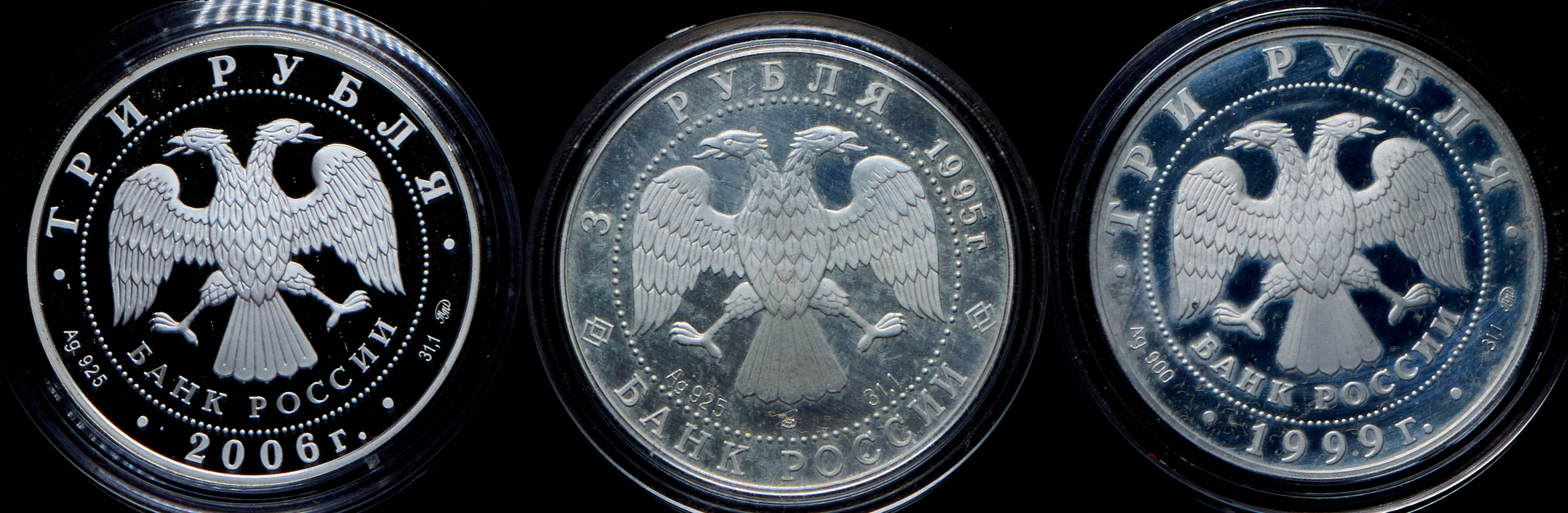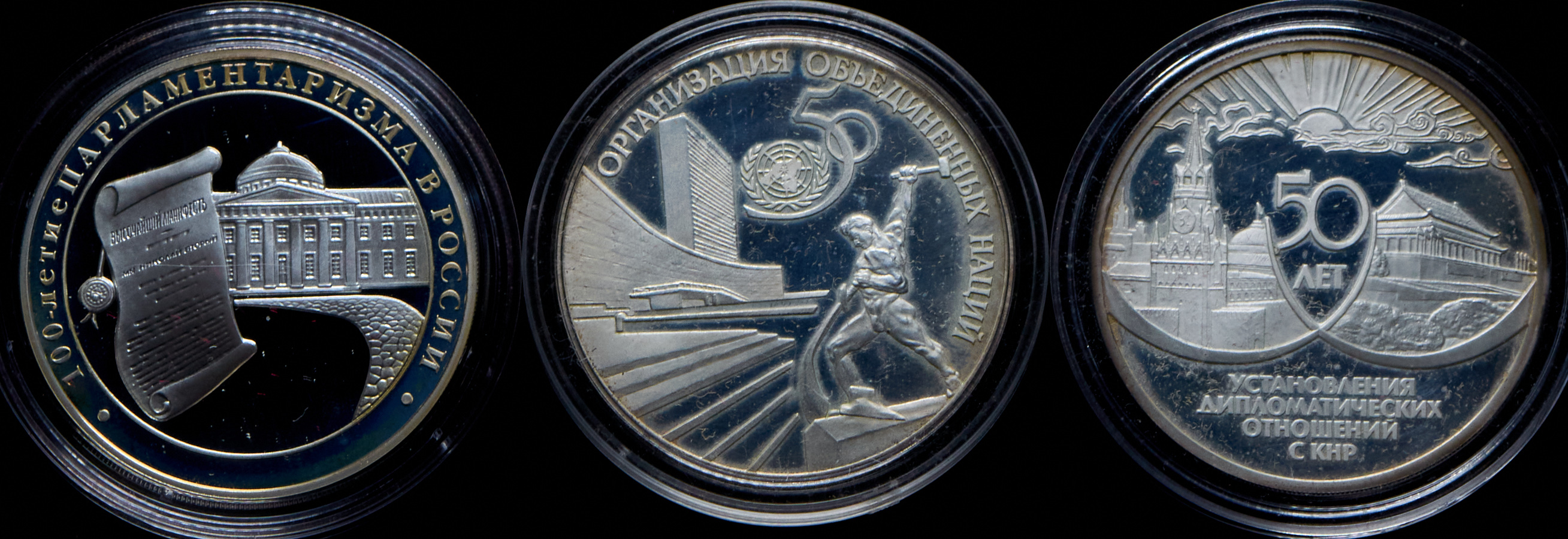 3 рубля 1995 "50-летие Организации Объединенных Наций". 3 рубля 1999 "50 лет установления дипломатических отношений с КНР". 3 рубля 2006 "100-летие парламентаризма в России".