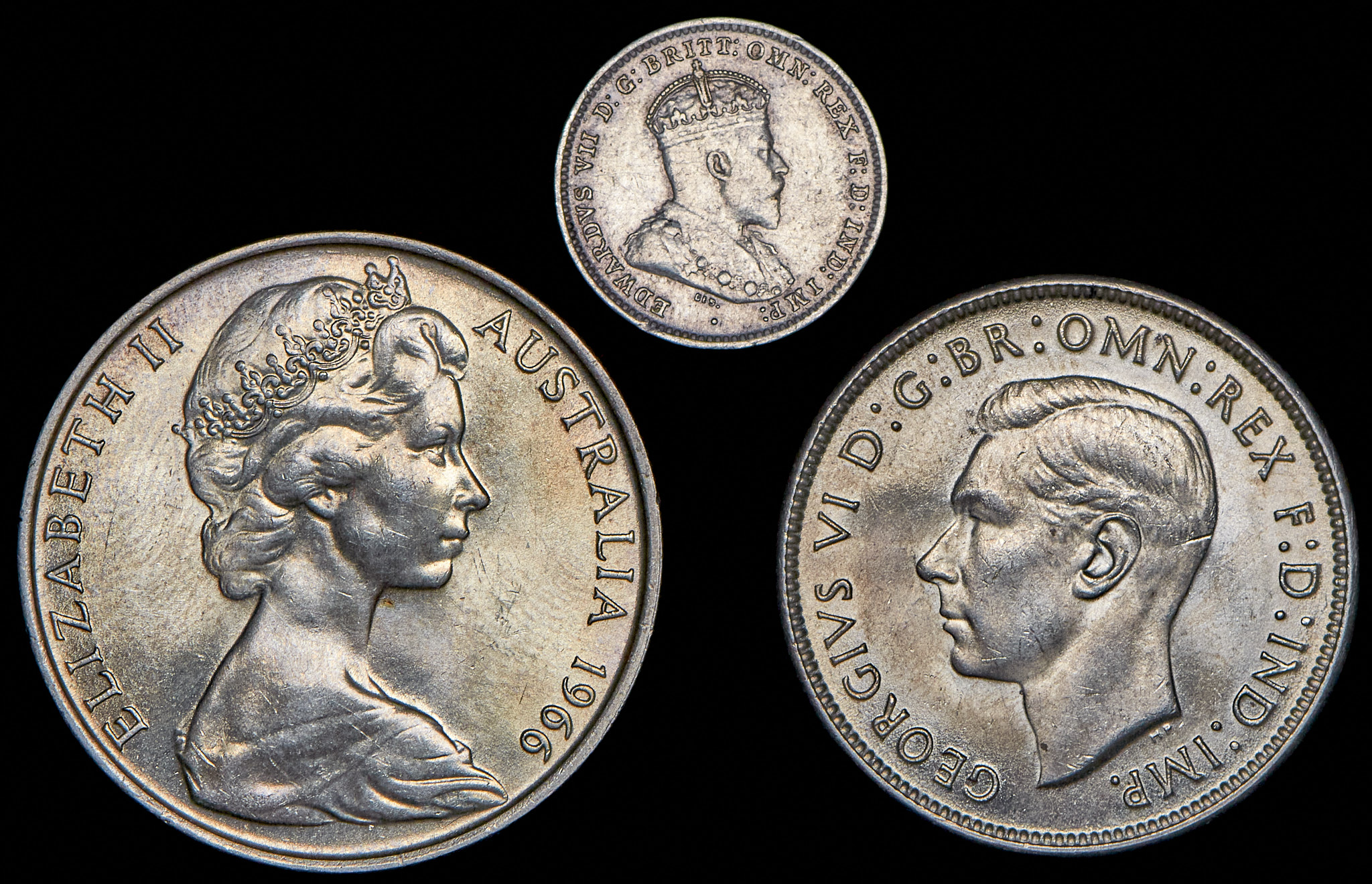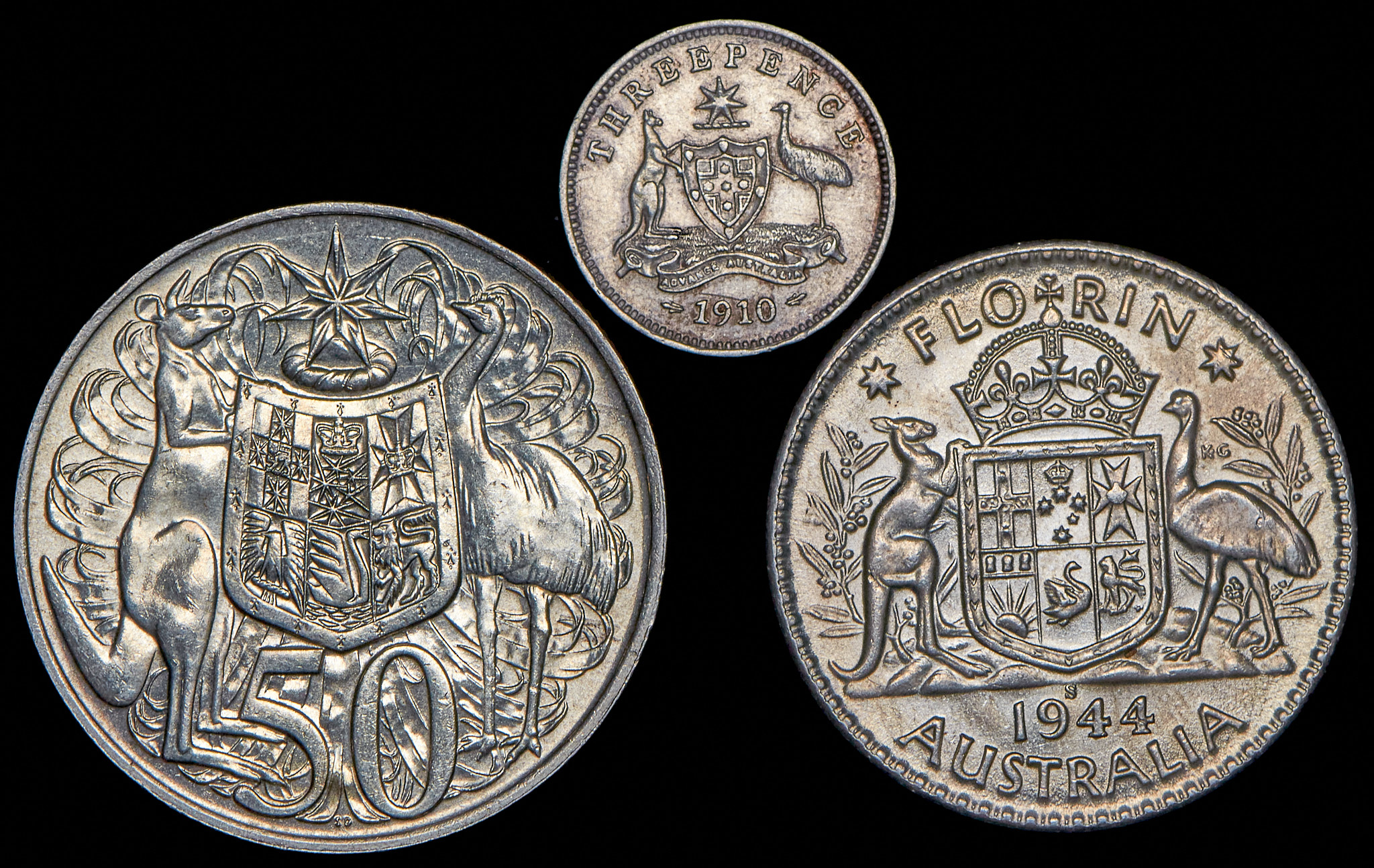 XF-MS. 3 пенса 1910, 1 флорин 1944, 50 центов 1966.