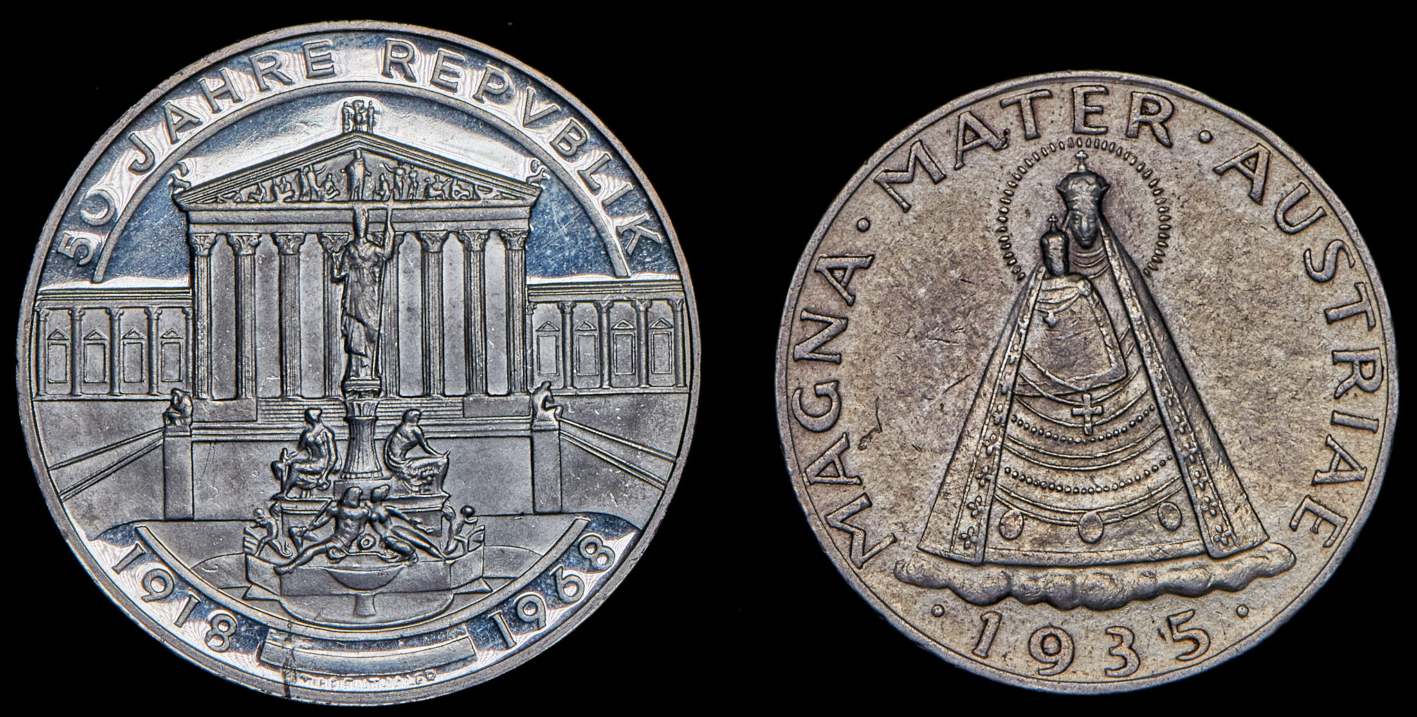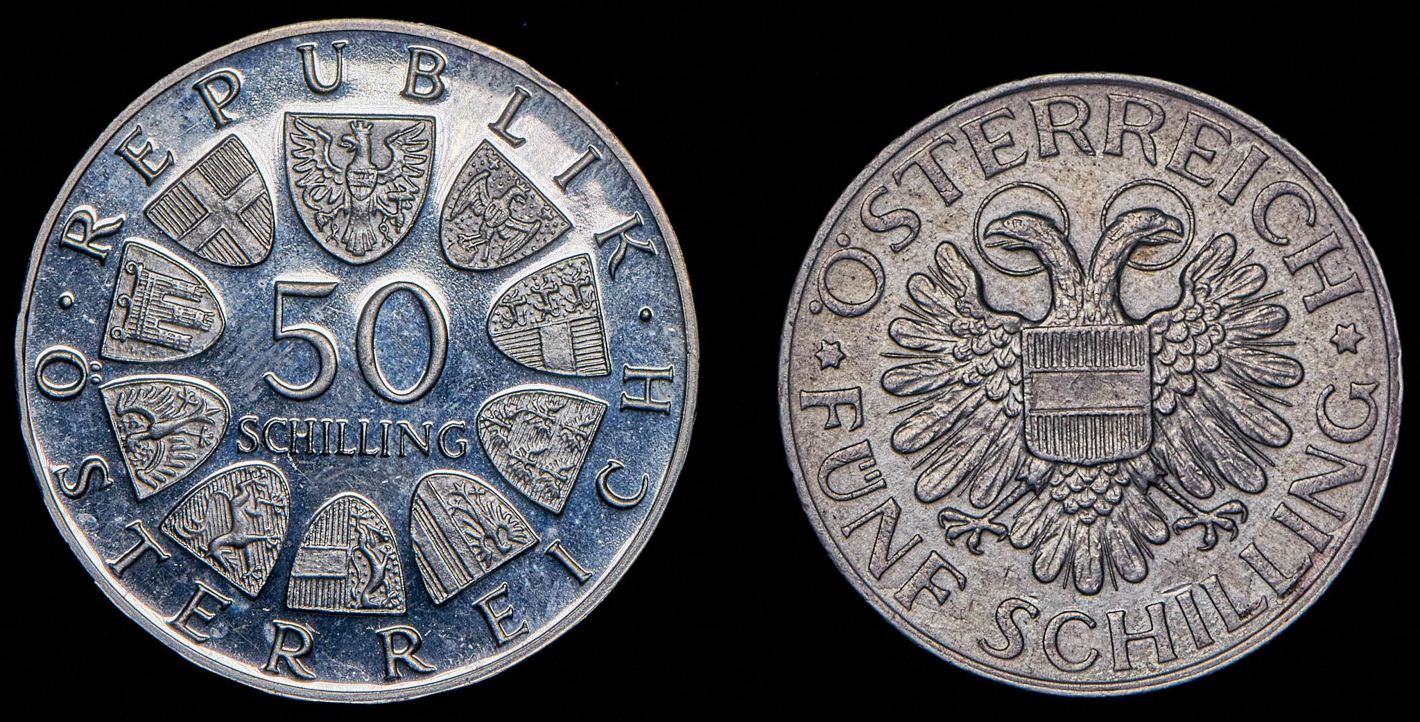 XF-PROOF. 5 шиллингов 1935, 50 шиллингов 1968.