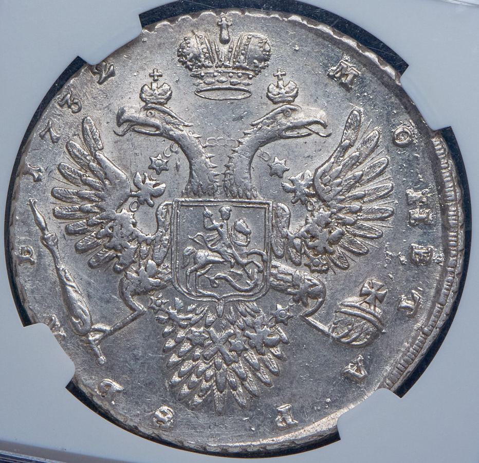 Тип 1731-1733 годов, т.н. "Портрет с локоном за ухом, с брошью на груди". Корона с крестом.