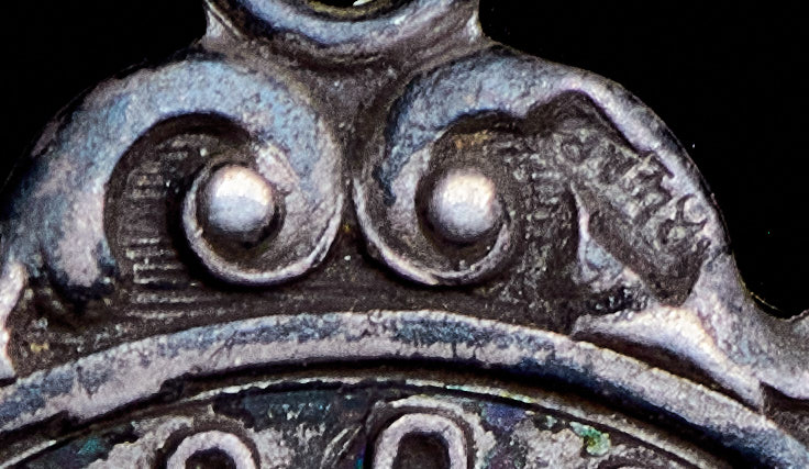 Размеры 35,3×23,2 мм. Неизвестная мастерская, Санкт-Петербург. Клейма на аверсе: вверху справа — проба металла с инициалами управляющего СПб пробирным округом А.В.Романова "84 АР", на ушке — нечитаемое клеймо.