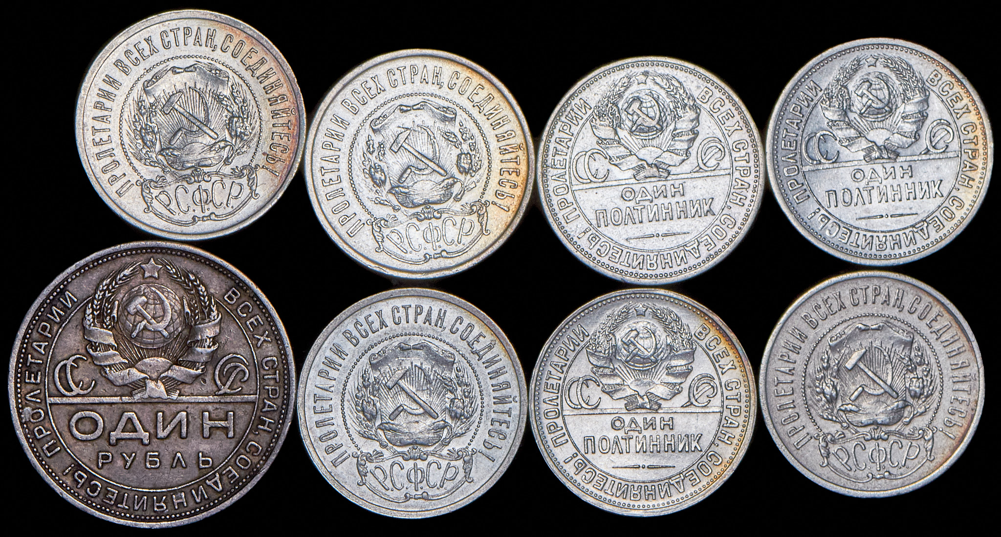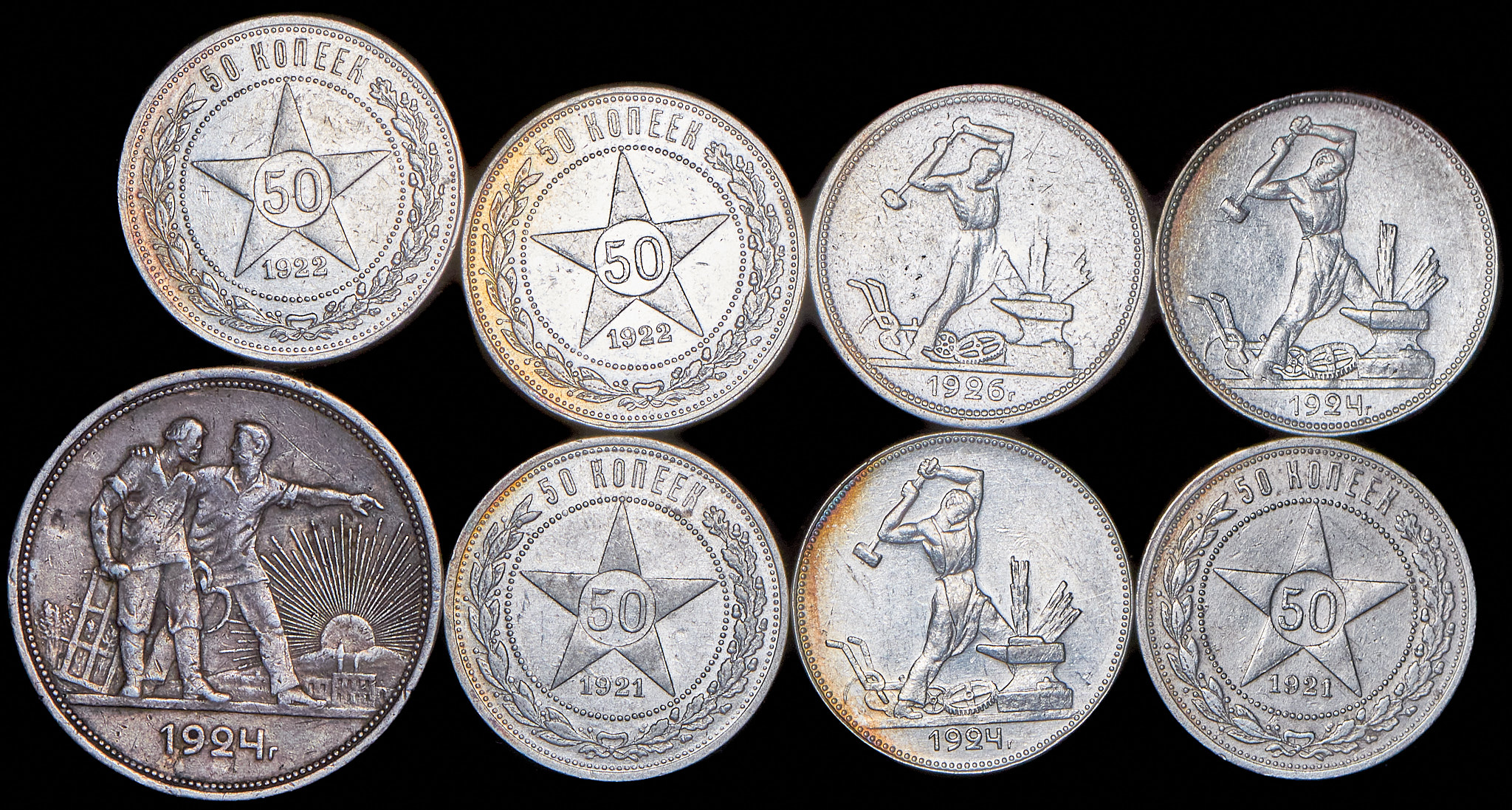 VF-AU. 50 копеек (4 шт.), Полтинник (3 шт.), Рубль.