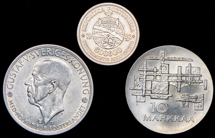 AU-MS.10 марок 1967 (Финляндия), 5 крон 1935 (Швеция), 500 эскудо 1983 (Португалия).