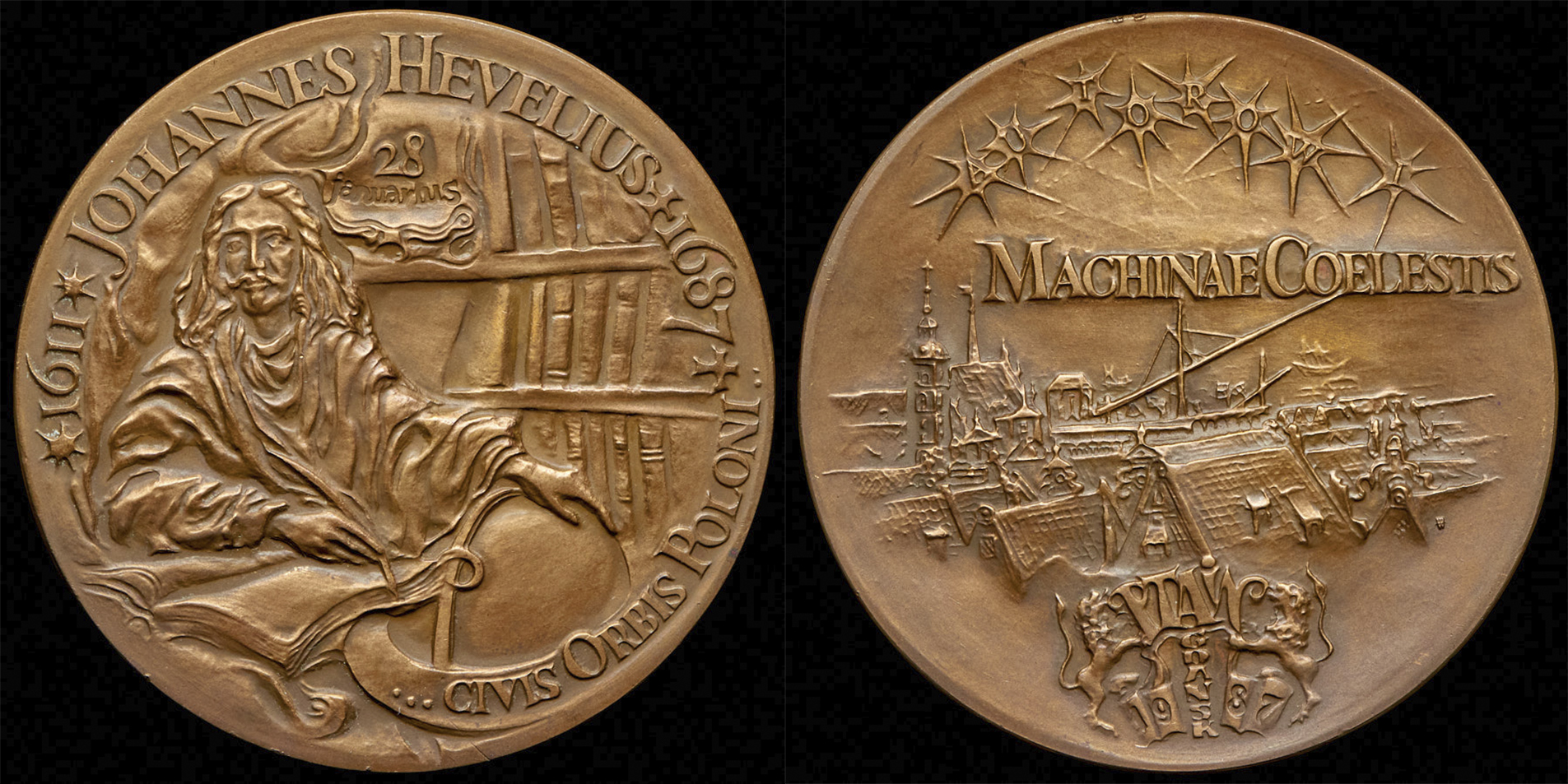 1) Томпак. Диаметр 70 мм. 1987 г. Медаль в память 200-летия со дня смерти Иоганна Гевелия 1611-1687. Польша. На обороте справа внизу знак варшавского монетного двора.