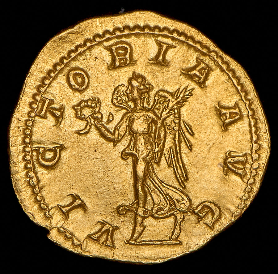 Легенда реверса "VICTORIA AVG". Крылатая Виктория, в драпировке, идет влево, держит венок в протянутой правой руке и пальмовую ветвь — в левой.