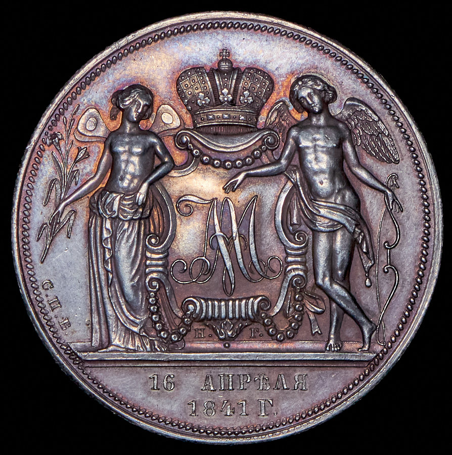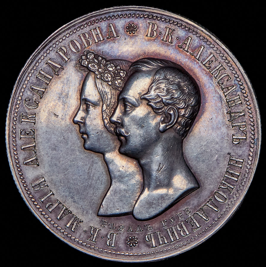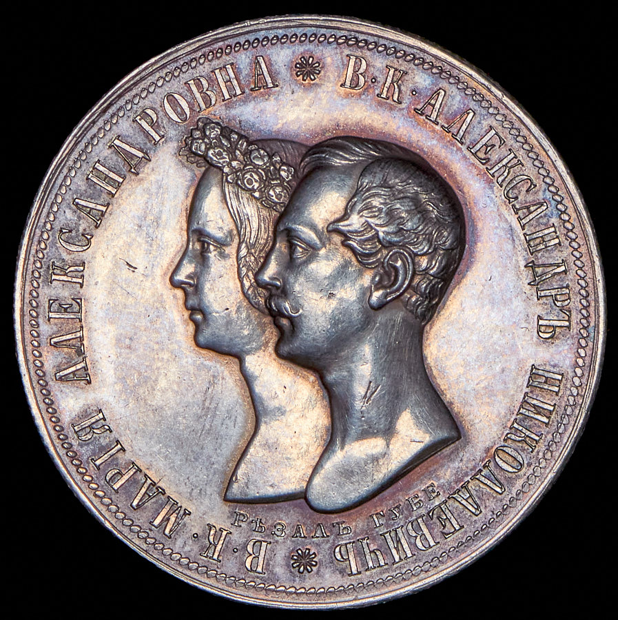 Чеканена по случаю бракосочетания Великого Князя Александра Николаевича, будущего императора Александра II, и Марии АлександровныПодпись медальера «РѢЗАЛЪ ГУБЕ» под портретами.