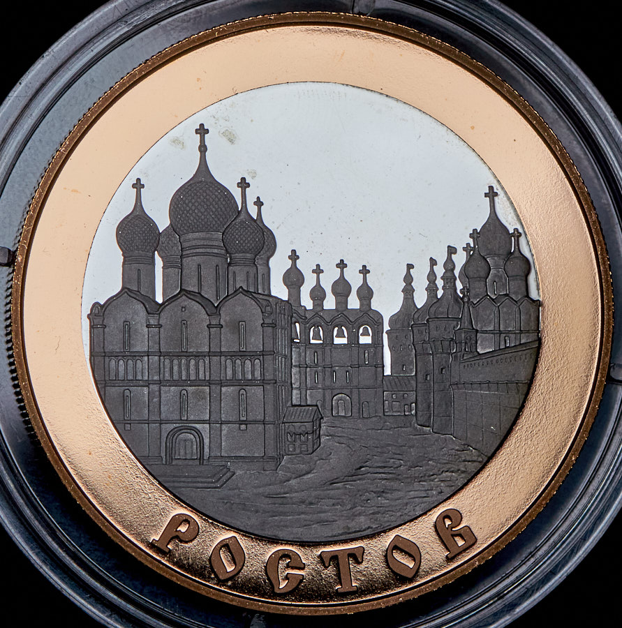 Реверс: на диске в центре – звонница (1682-1687 гг.), слева – Успенский собор (XVI в.), справа –церковь Воскресения (1670 г.), на кольце внизу по окружности – надпись: «РОСТОВ».
