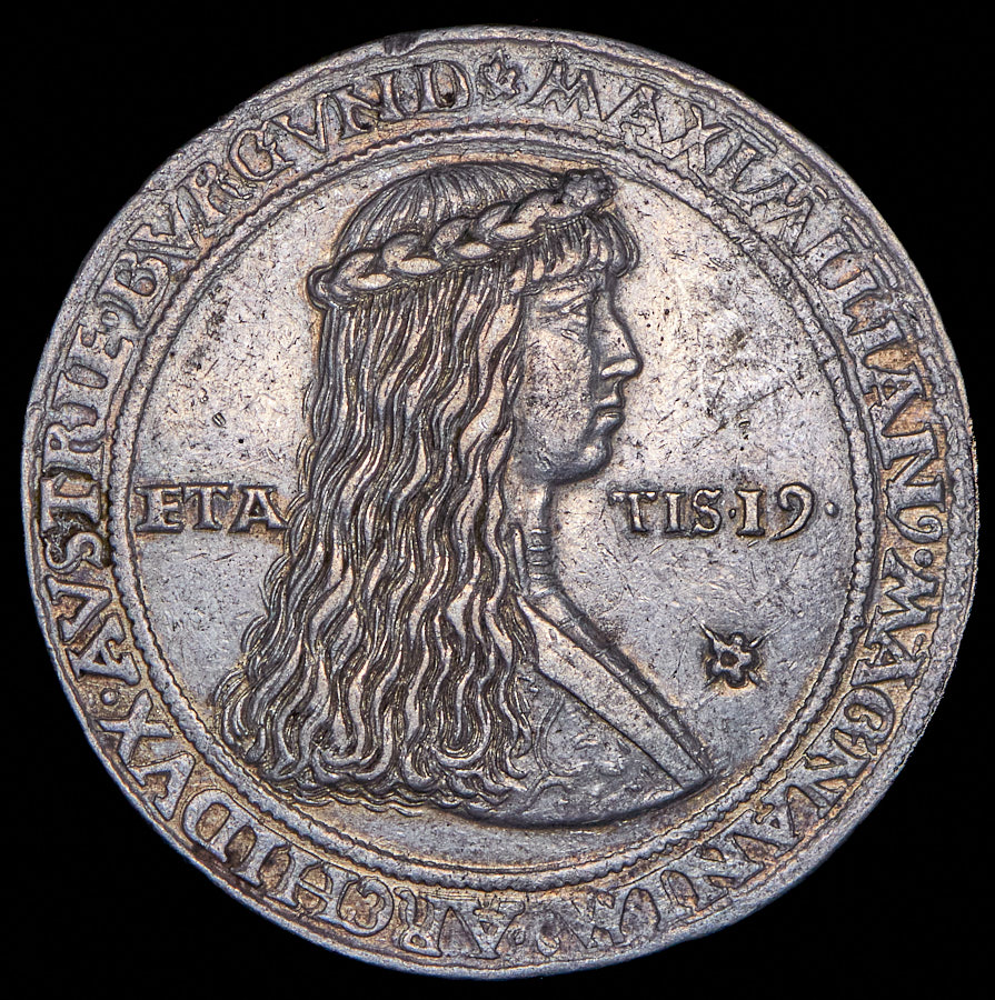 Круговая легенда аверса "MAXIMILIAN9 MAGNANIM9 ARCHIDVX AVSTRIE BVRGVND"; портрет Максимилиана I.