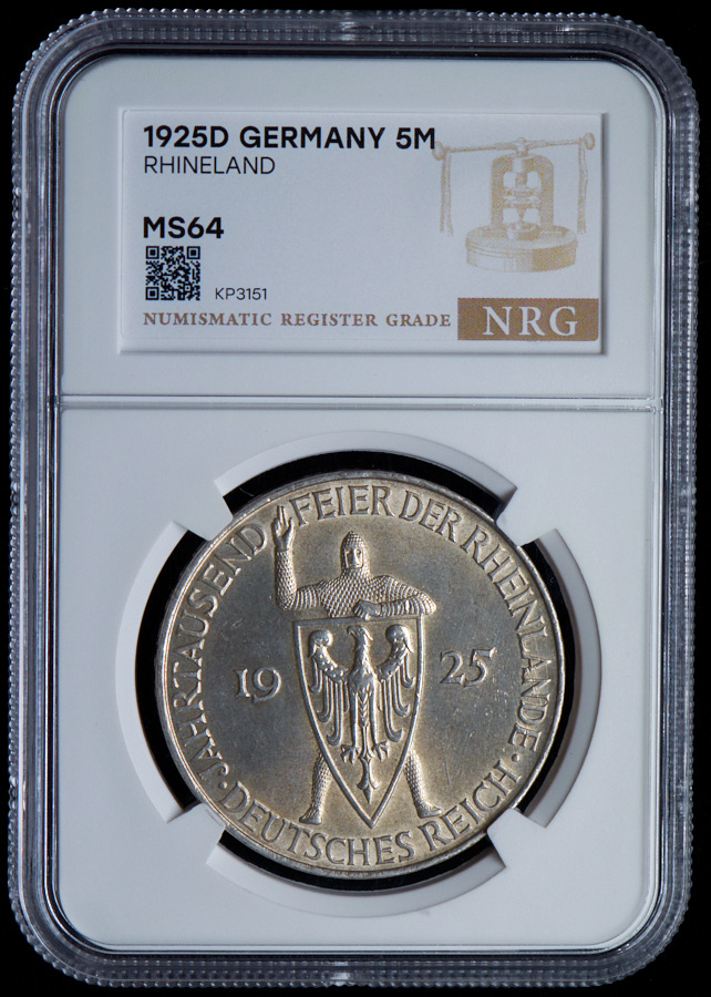 5 марок 1925 "1000-летие Рейнланда" (Германия) (в слабе) D