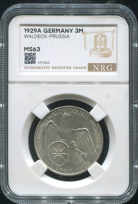 3 марки 1929 "Объединение Вальдека и Пруссии" (Германия) (в слабе)