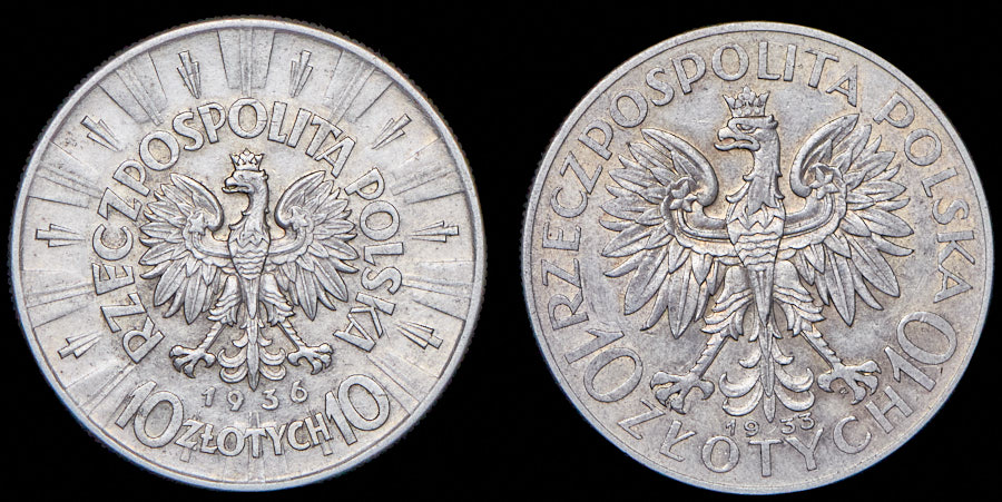 Набор из 2 сер. монет 10 злотых 1933, 1936 (Польша)