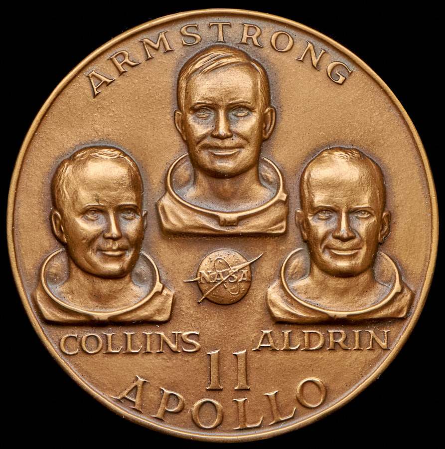 Диаметр 63 мм. Космонавты: Армстронг, Коллинс, Алдрин (Armstrong, Collins, Aldrin). На обороте надпись: Первая высадка человека на Луну 20-21 июля 1969 (Man’s first Lunar landing July 20-21 1969). США. На гурте клеймо: MEDALLIC ART CO.N.Y. BRONZE.